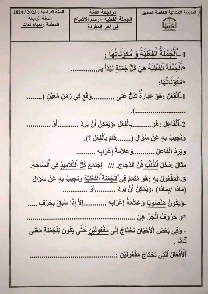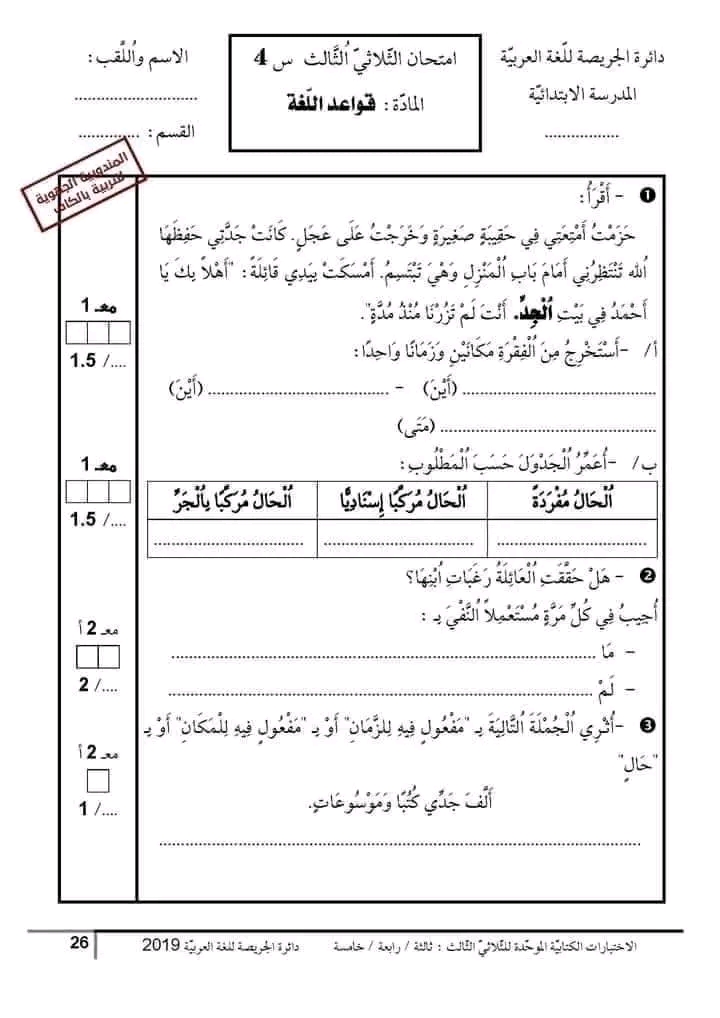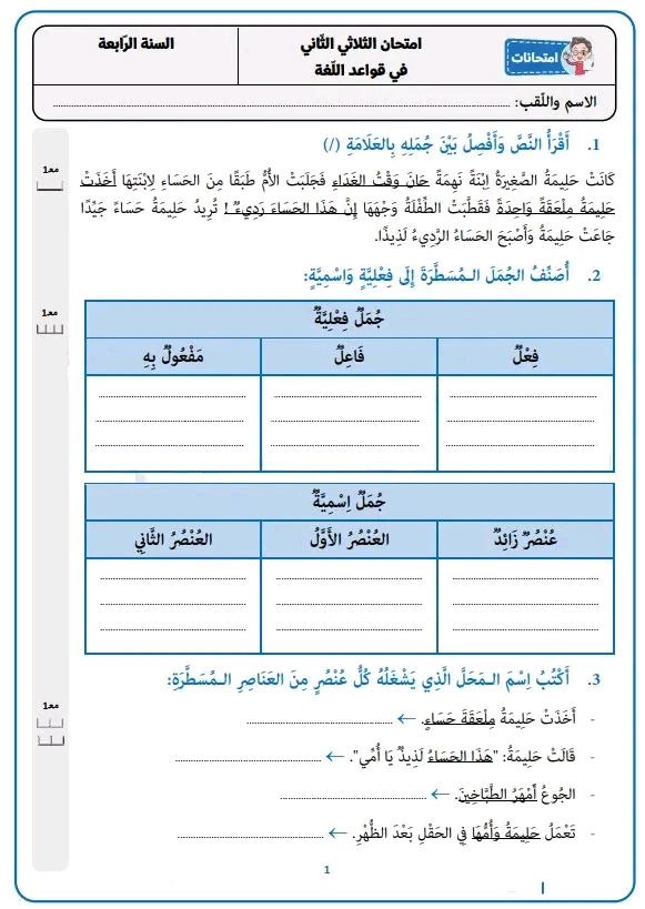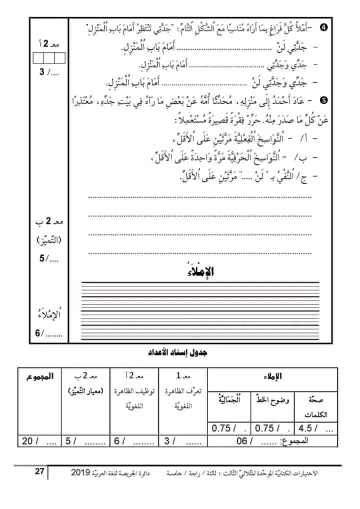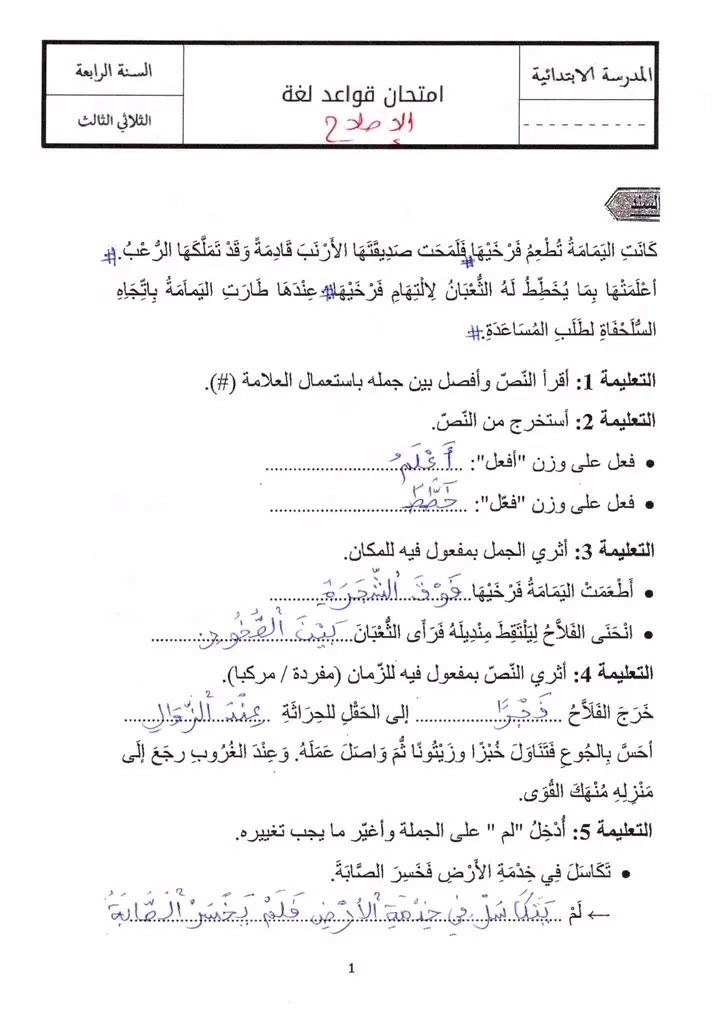 اختبار لغة سنة رابعة ثلاثي ثاني مع الاصلاح