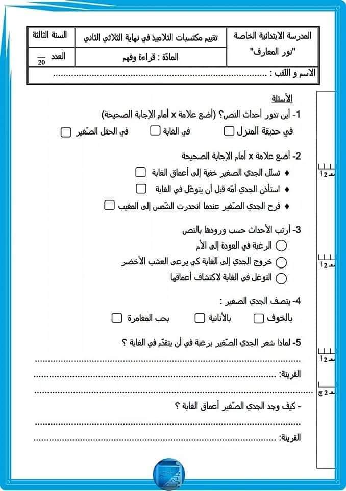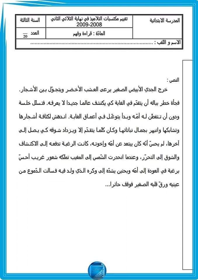 تقاييم قراءة وفهم سنة ثالثة الثلاثي الثاني