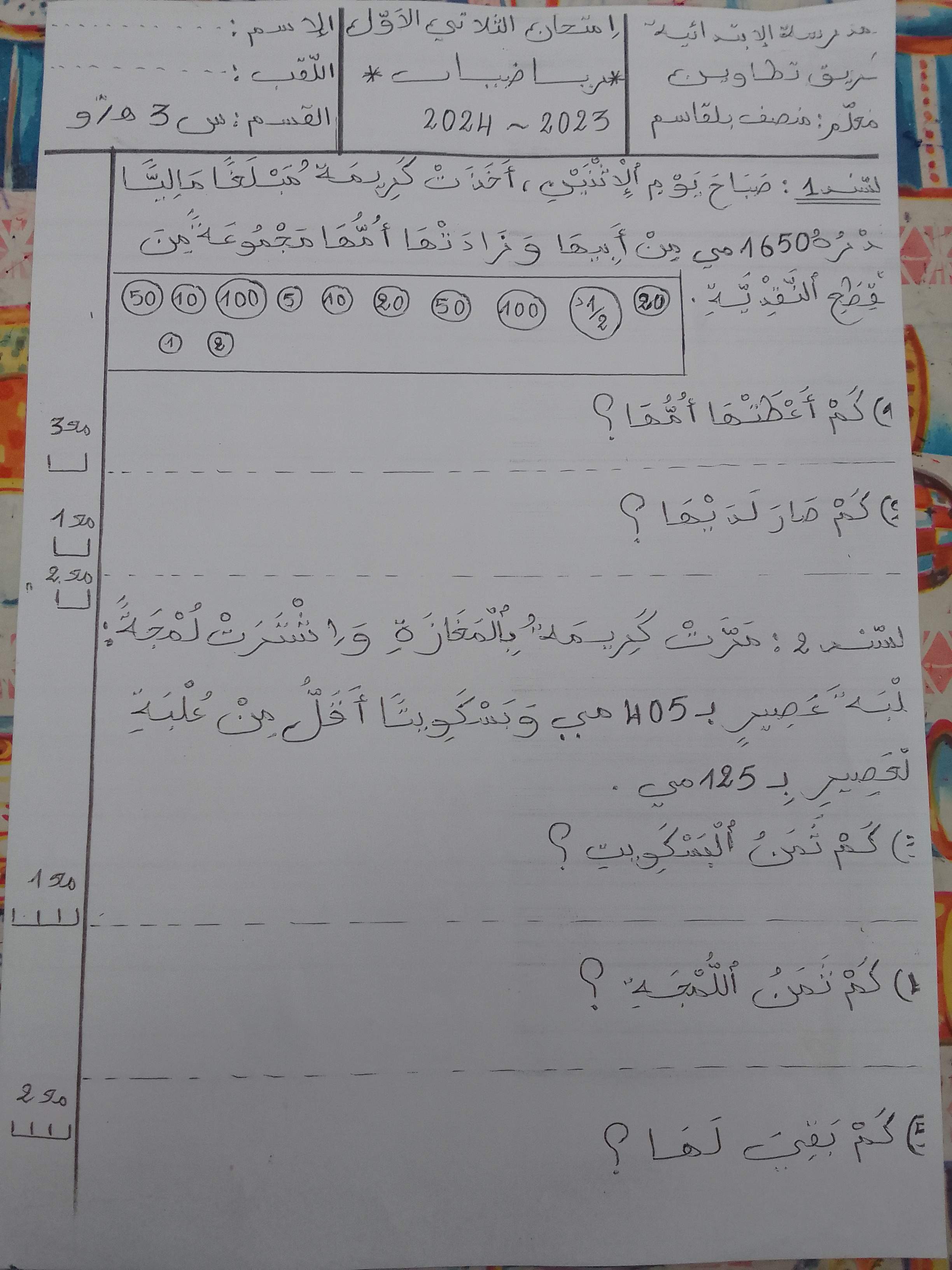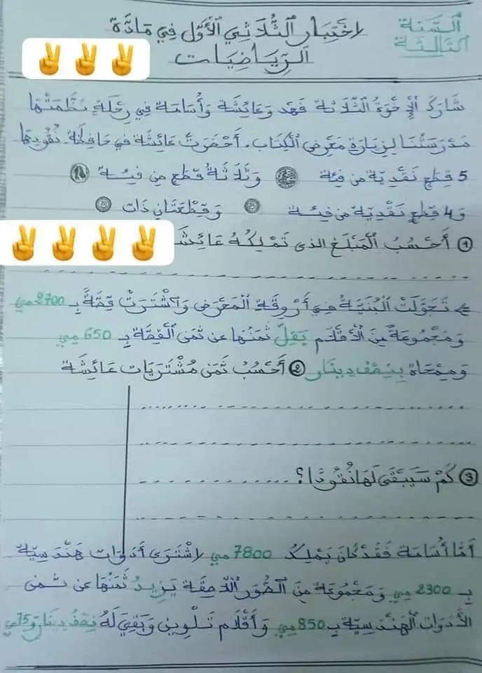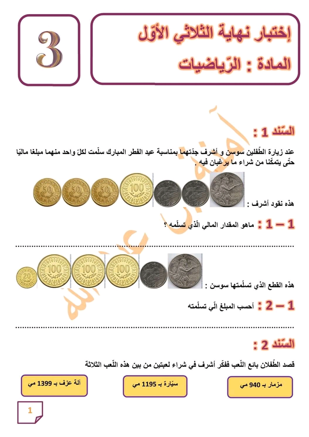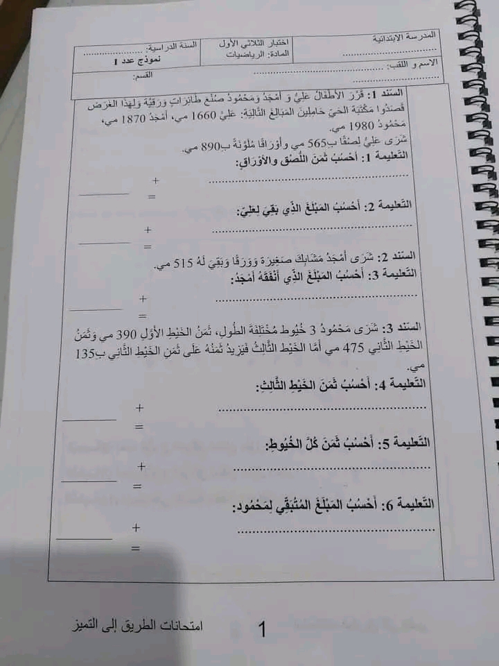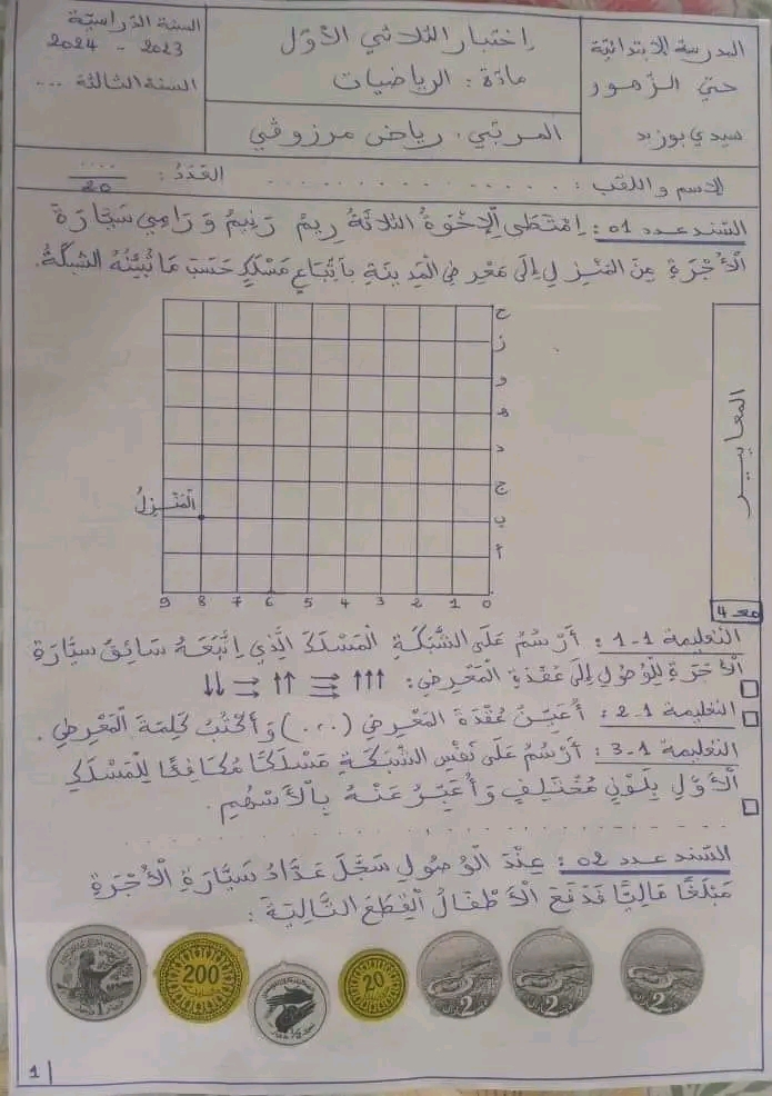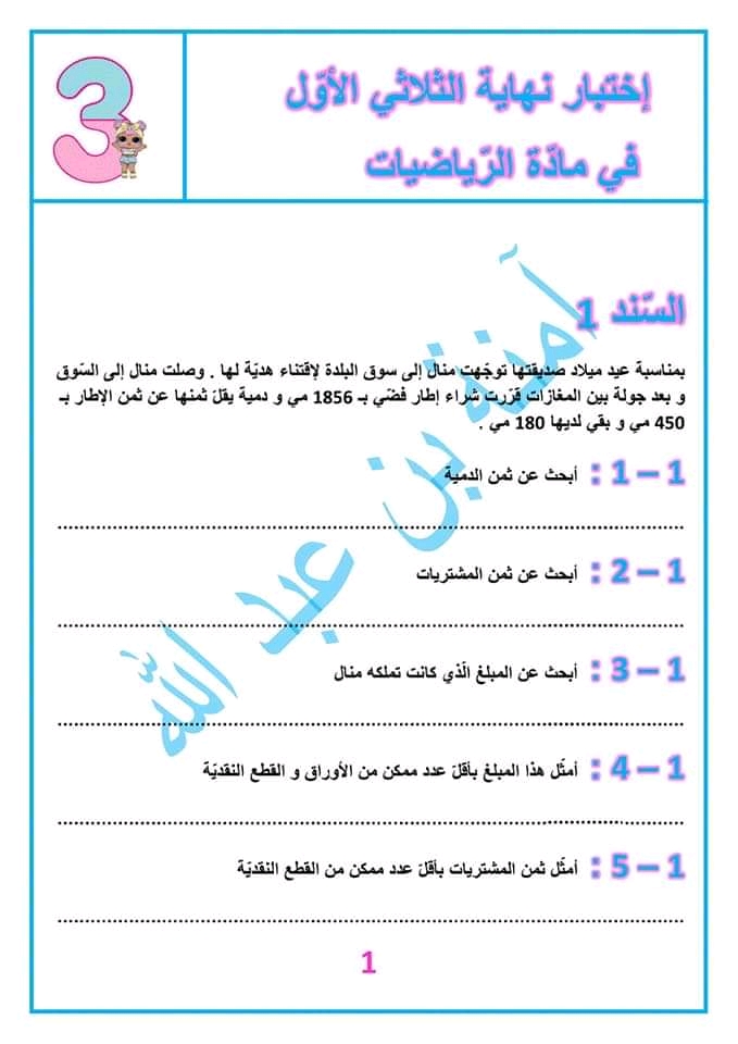اختبار رياضيات سنة ثالثة ثلاثي 1