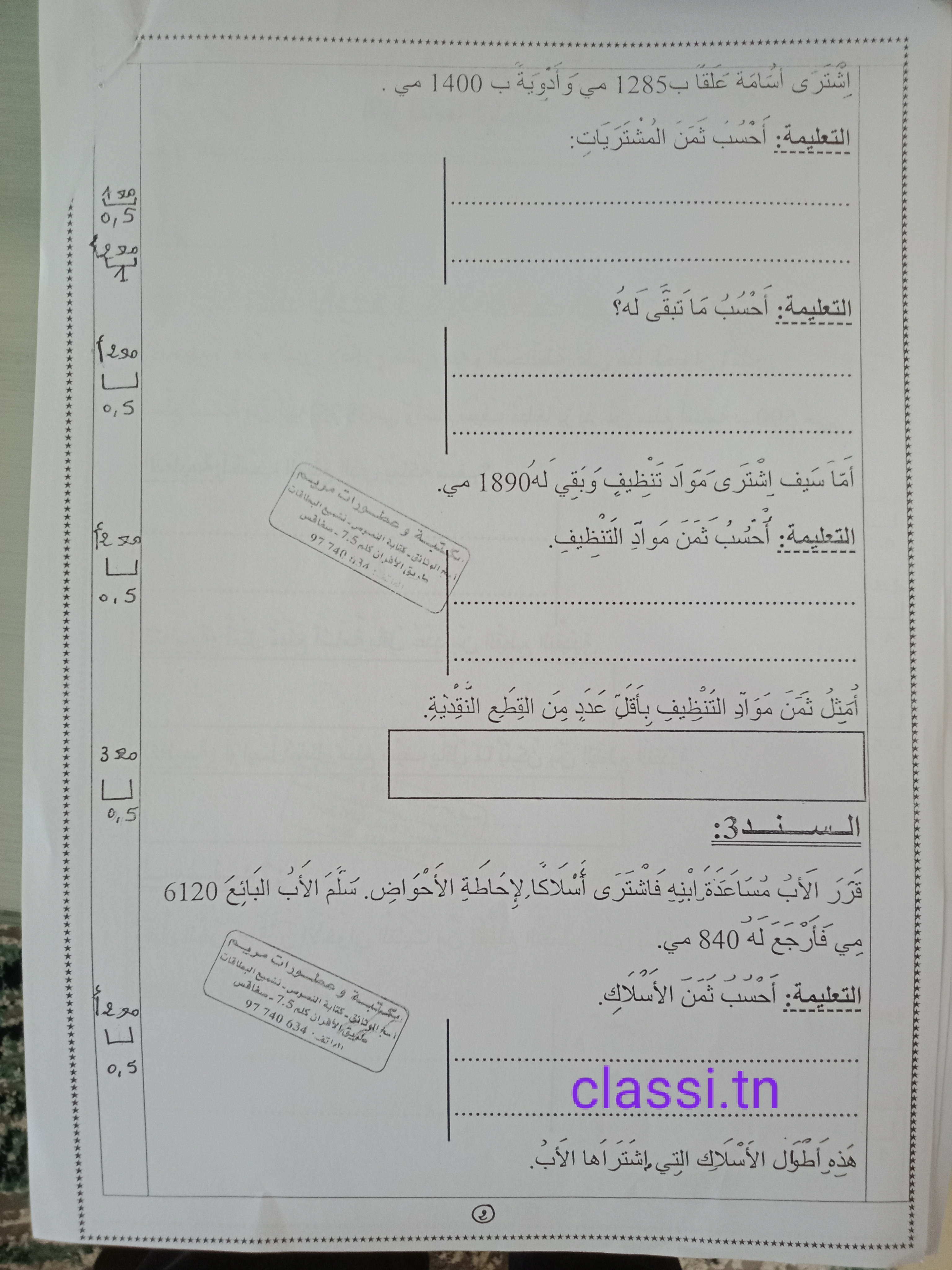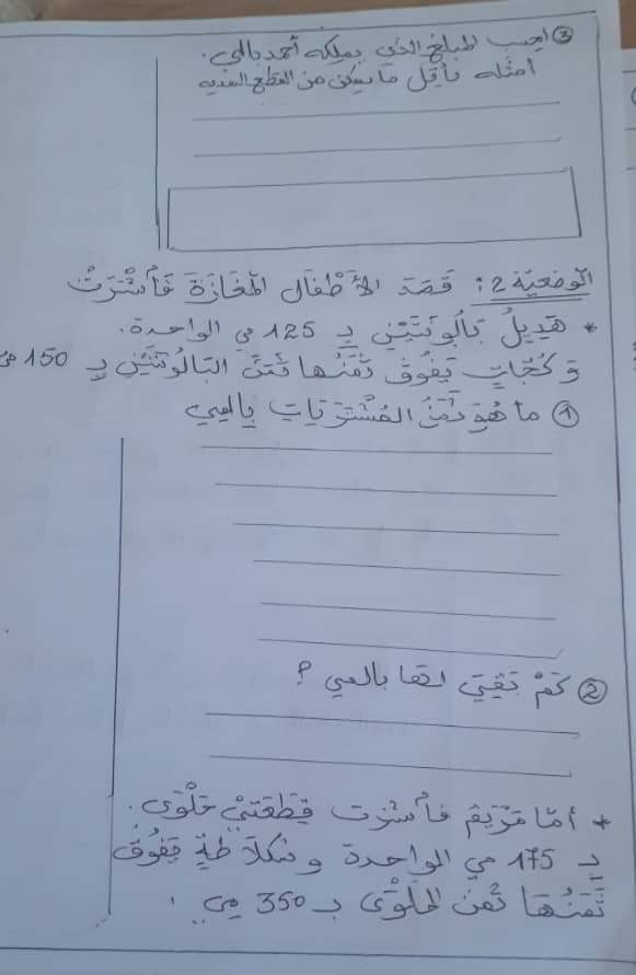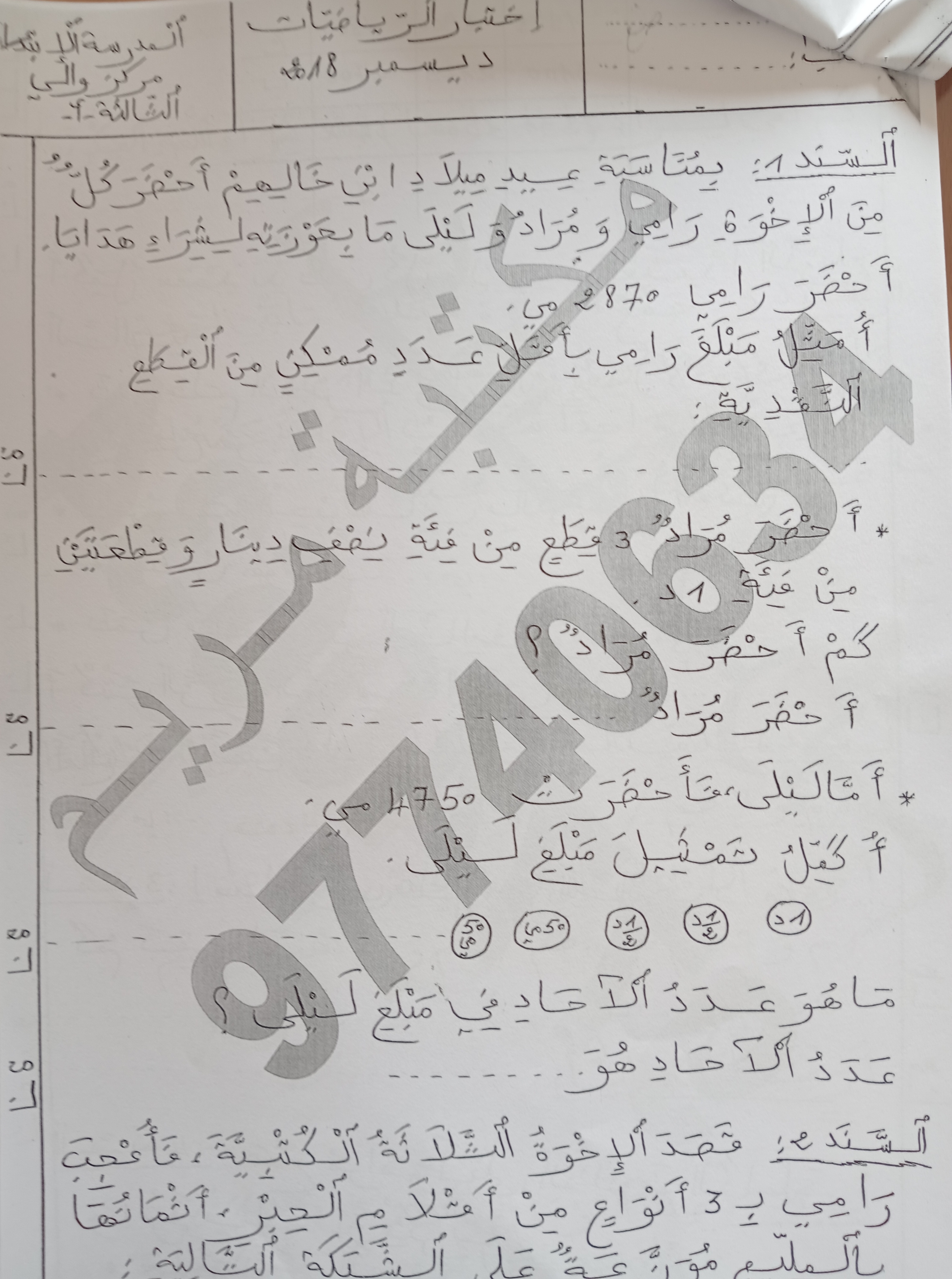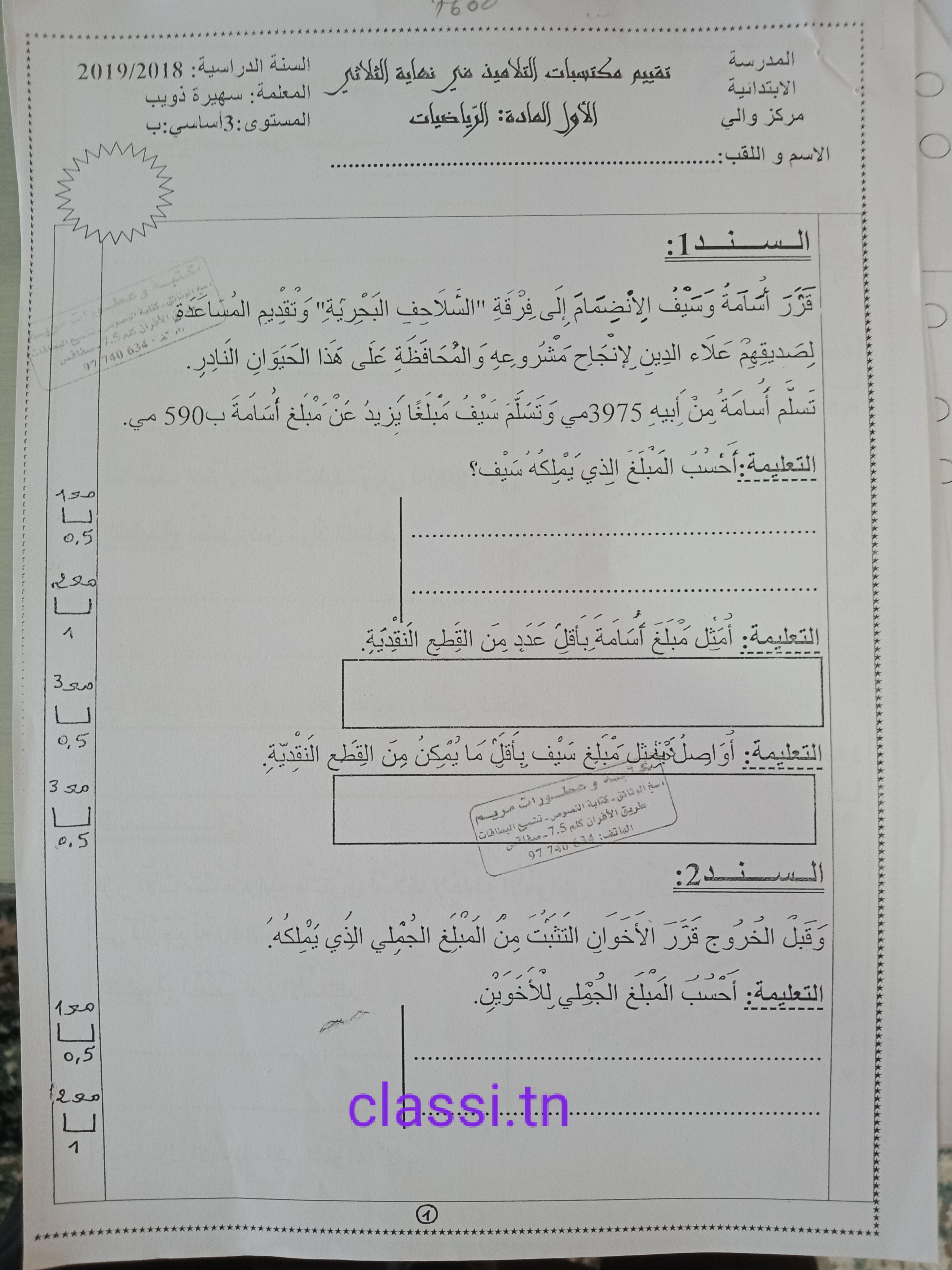 اختبار رياضيات سنة ثالثة ثلاثي 1