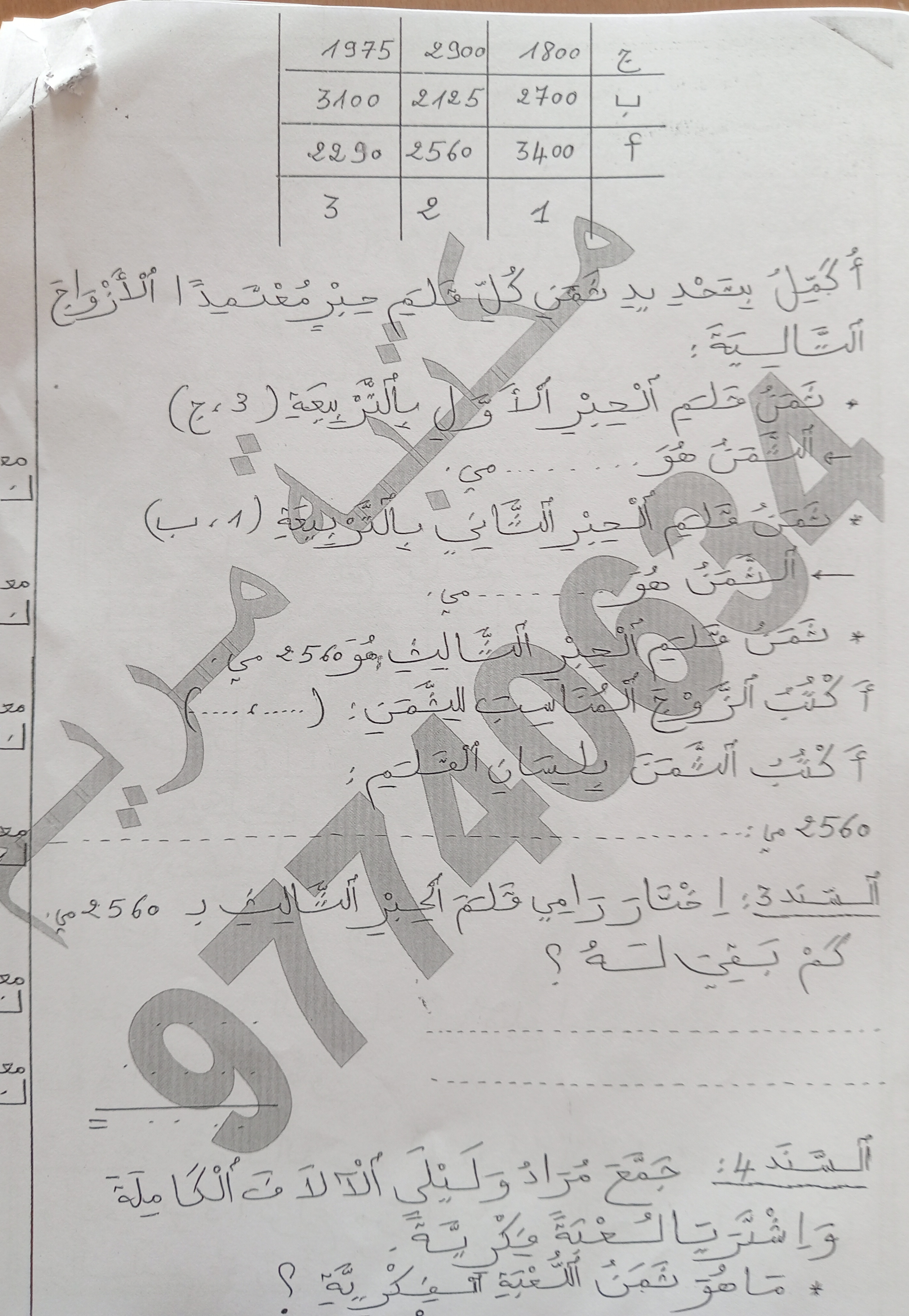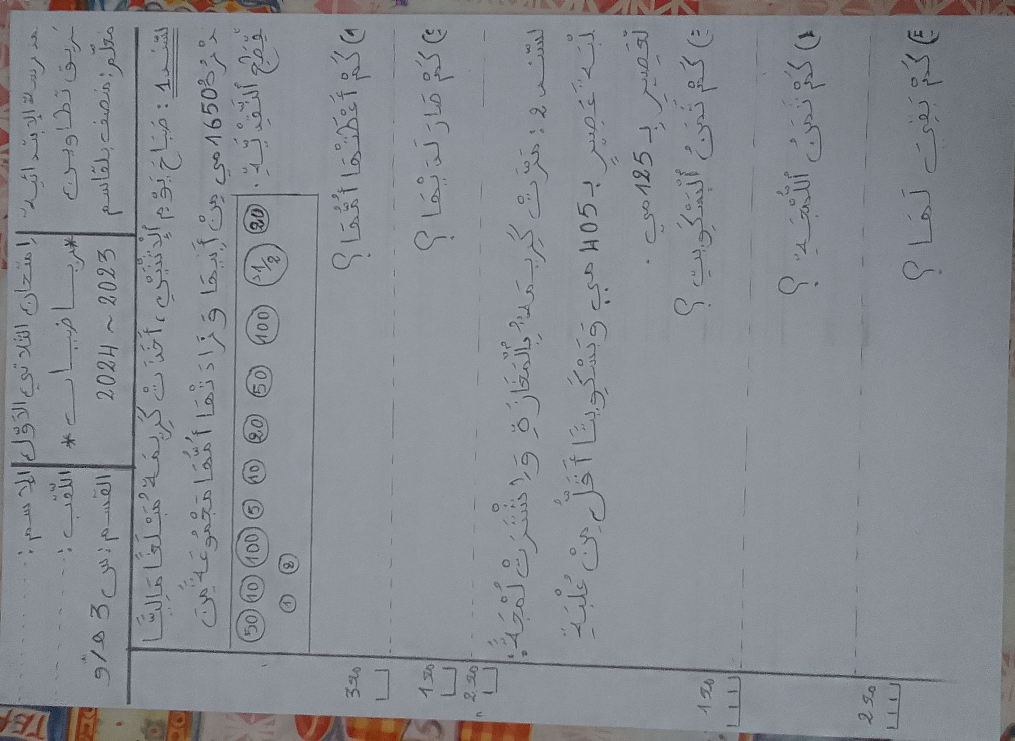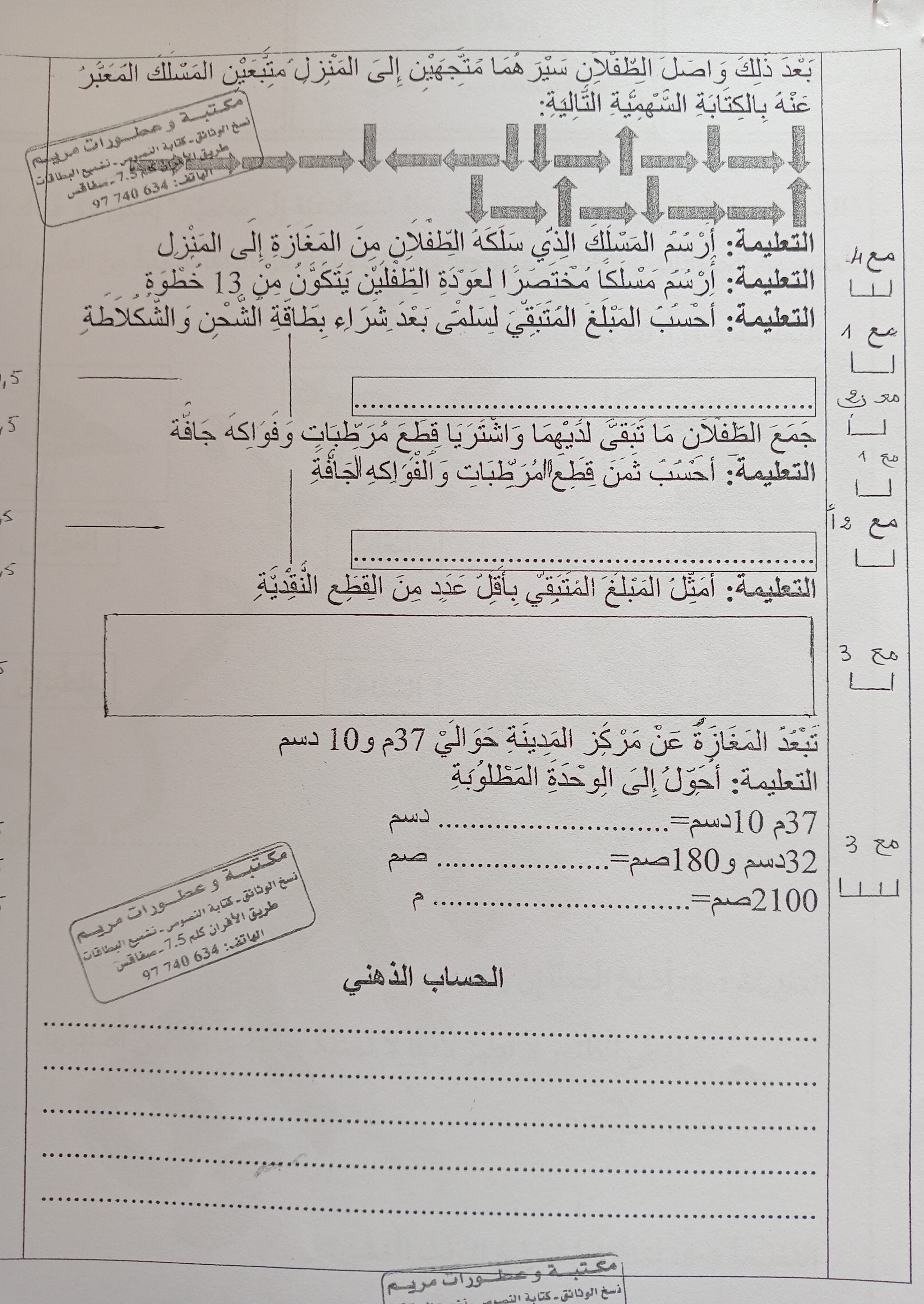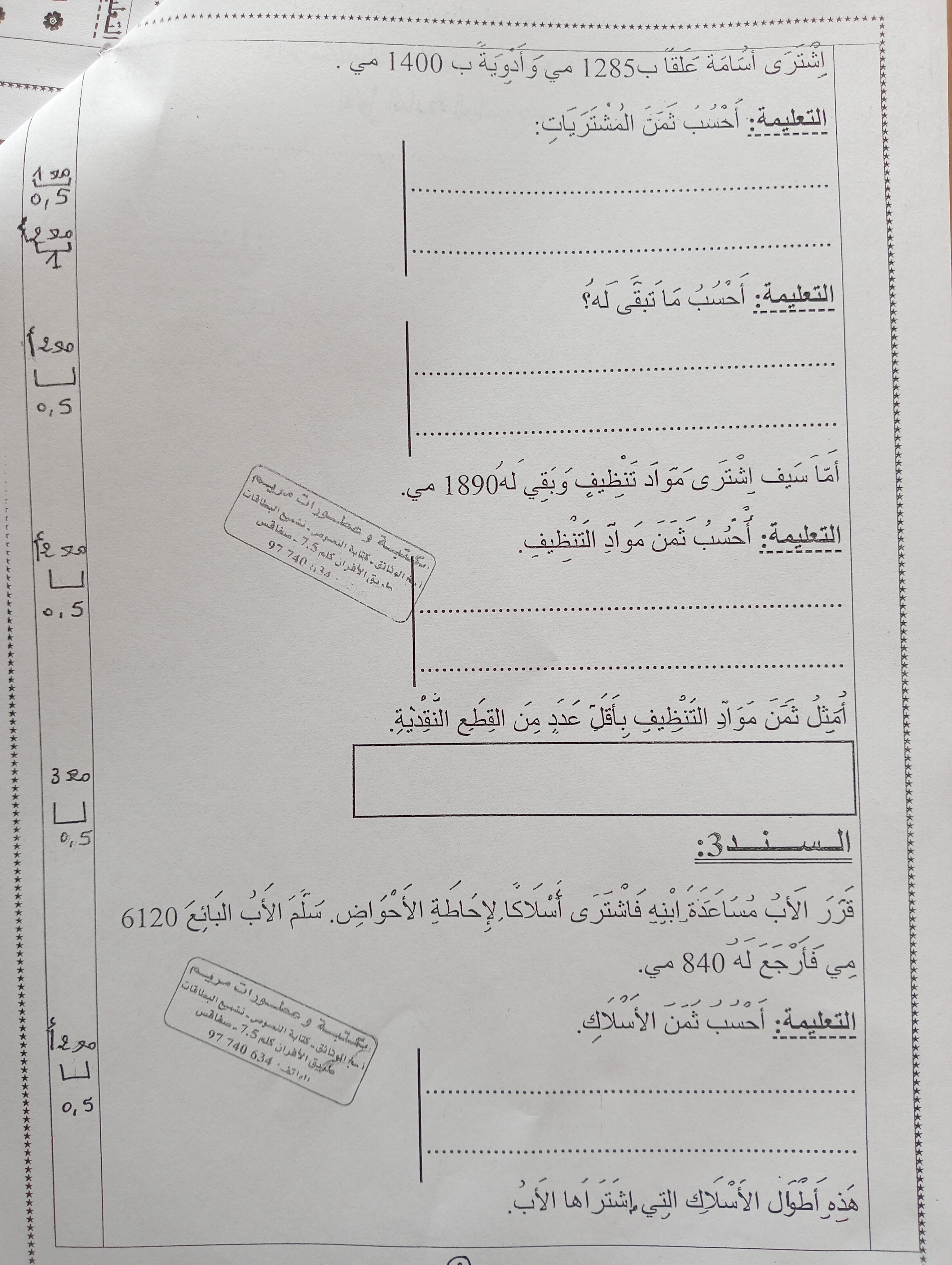 اختبار رياضيات سنة ثالثة ثلاثي 1