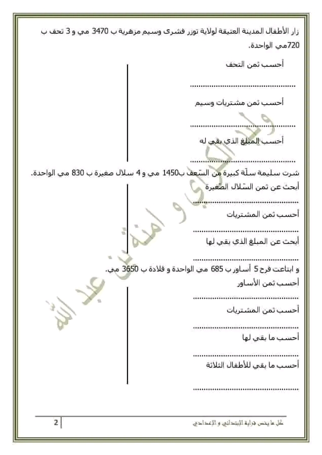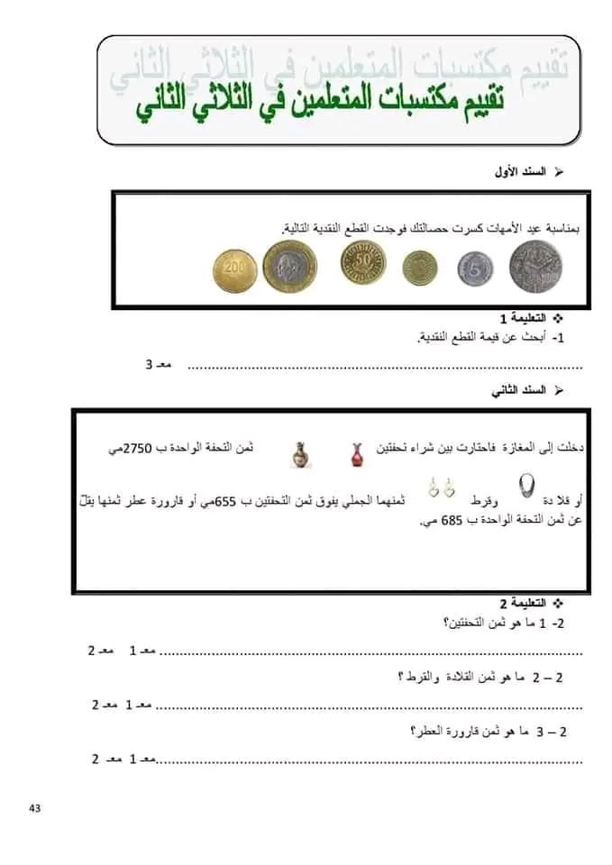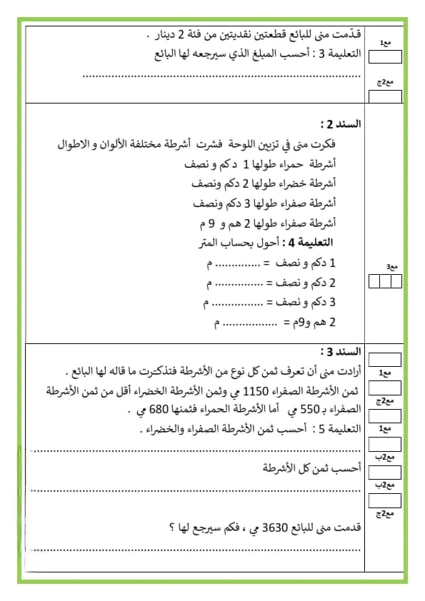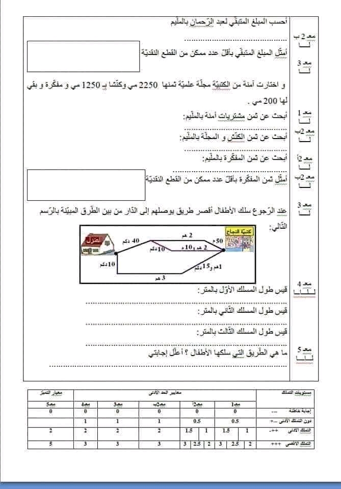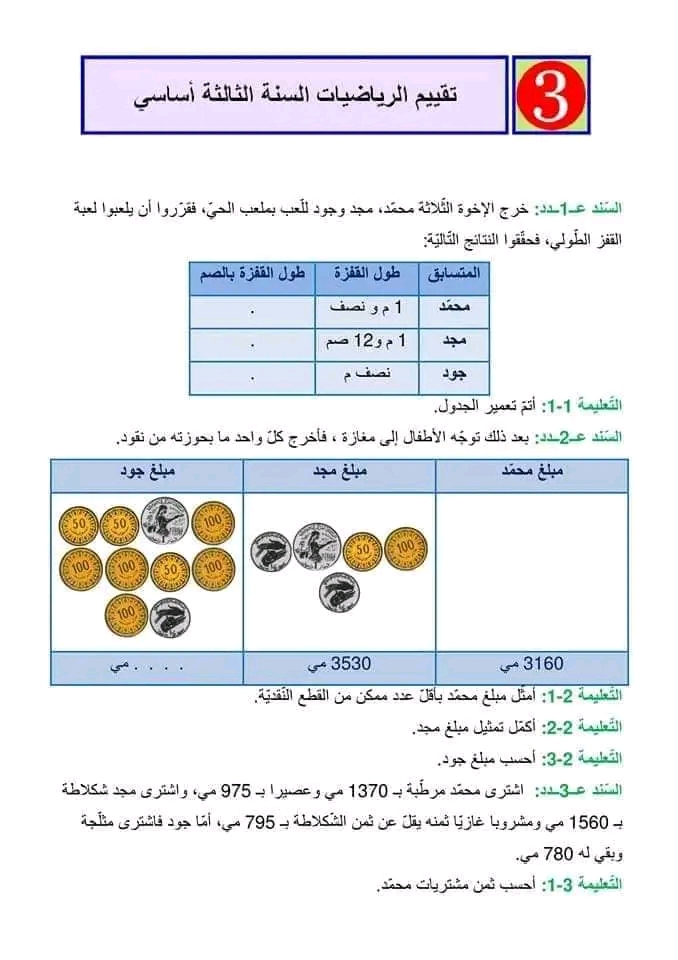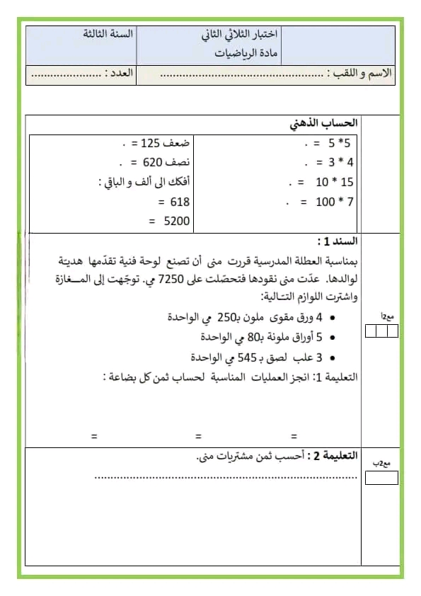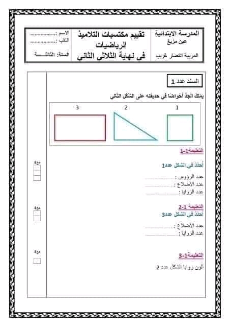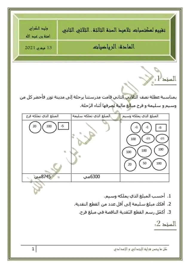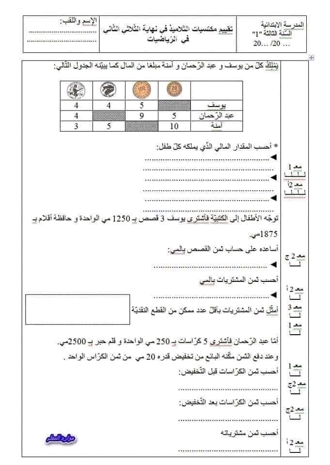 تقييم رياضيات سنة ثالثة ث 2