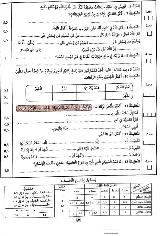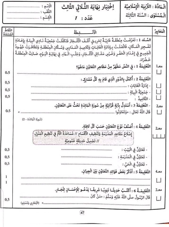 اختبار تربية اسلامية الثلاثي الثالث بالتوفيق