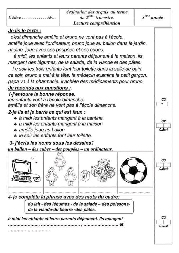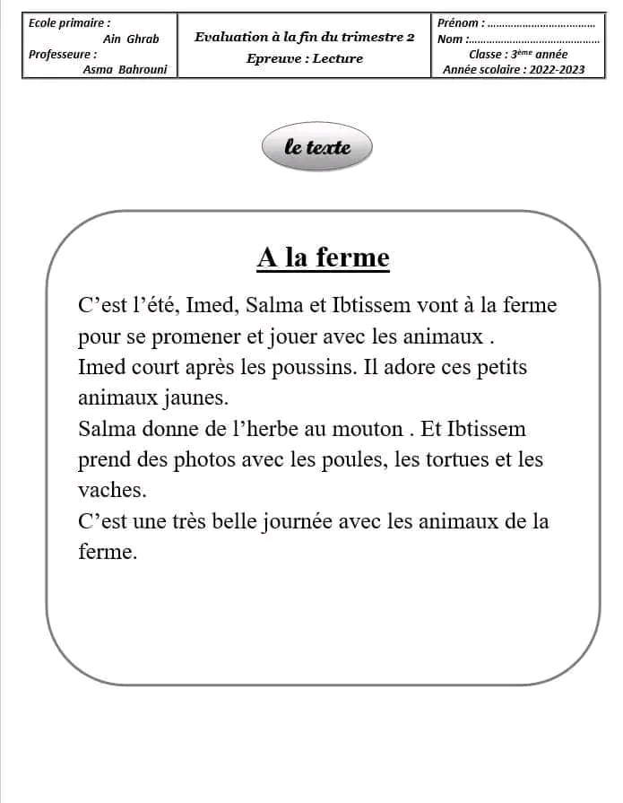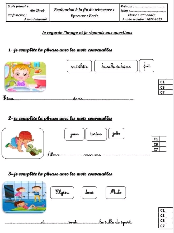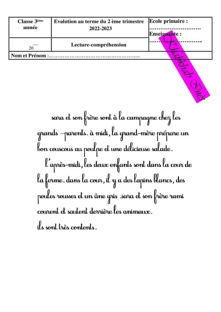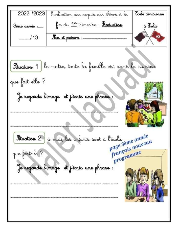 تقييم ثلاثي ثاني بالاصلاح فرنسية سنة ثالثة