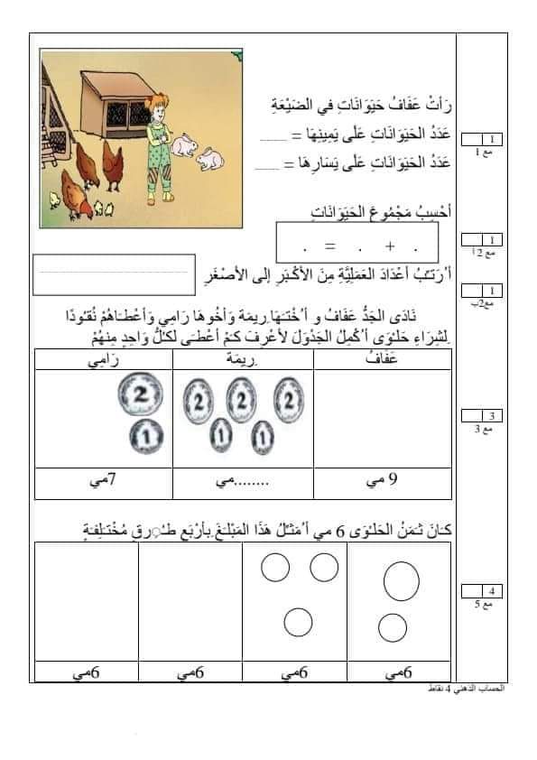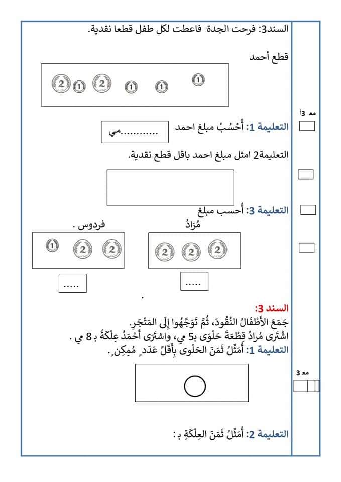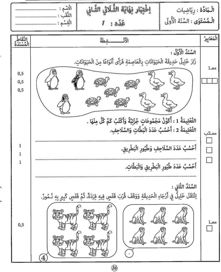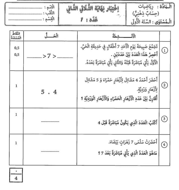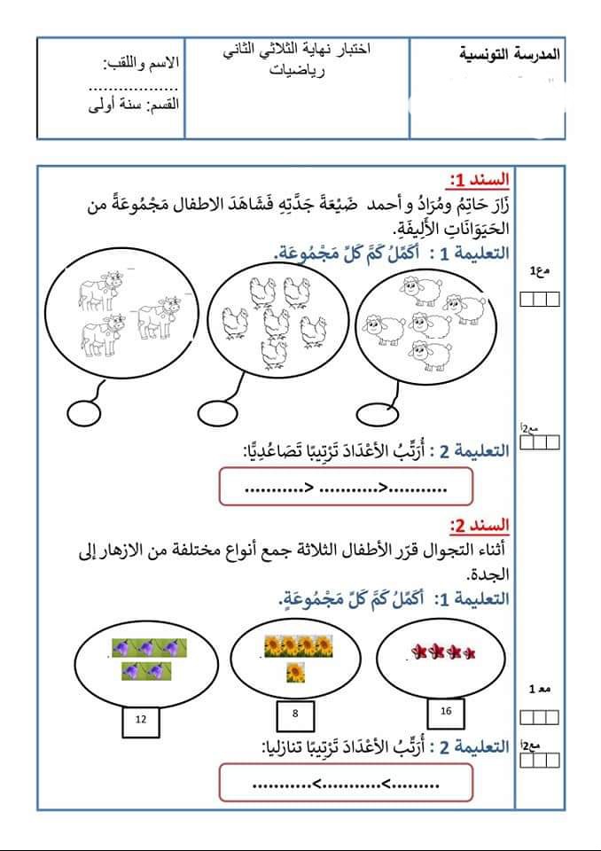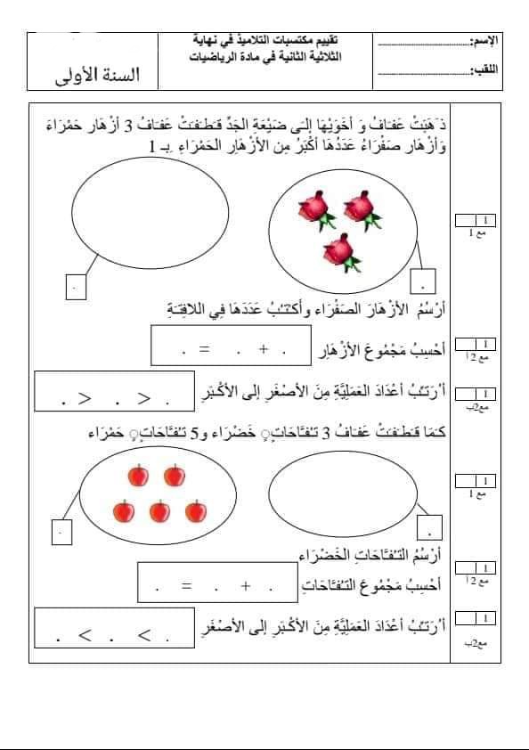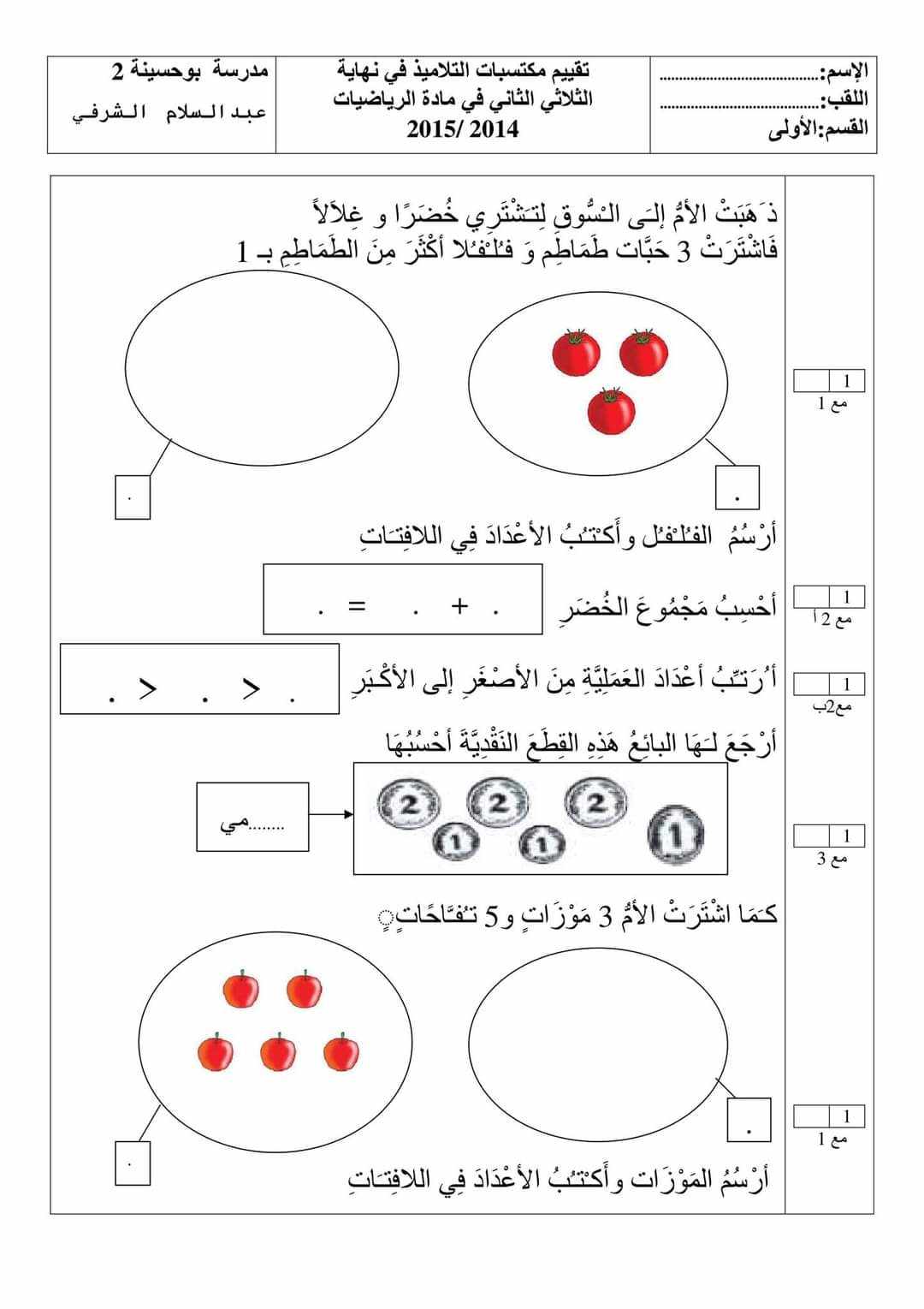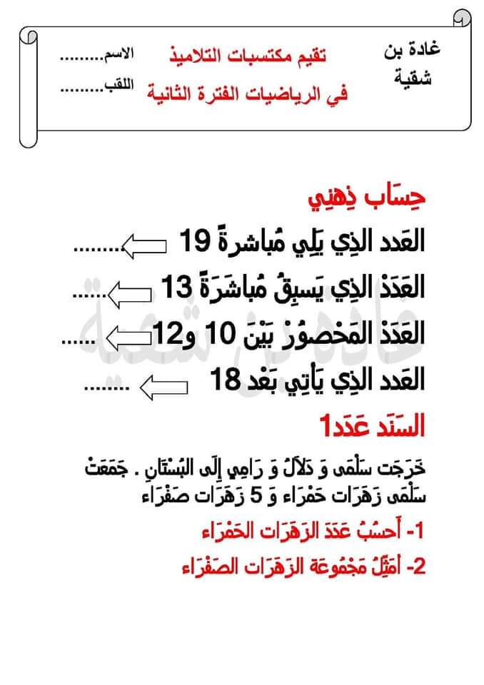 تقاييم رياضيات سنة اولى الثلاثي الثاني