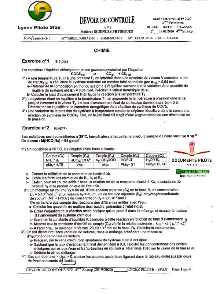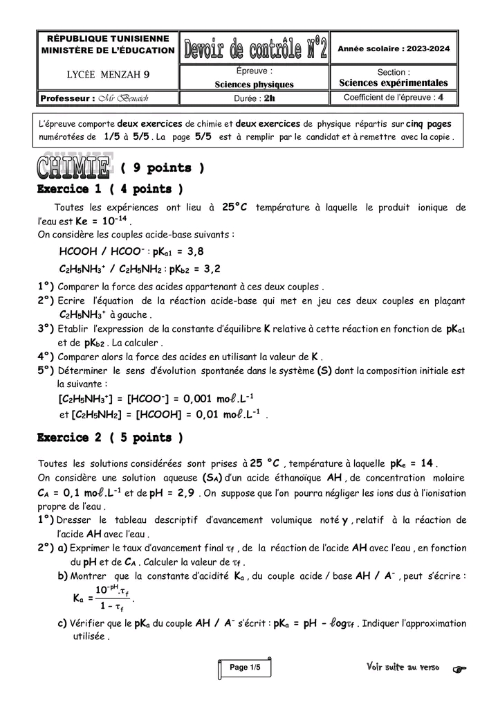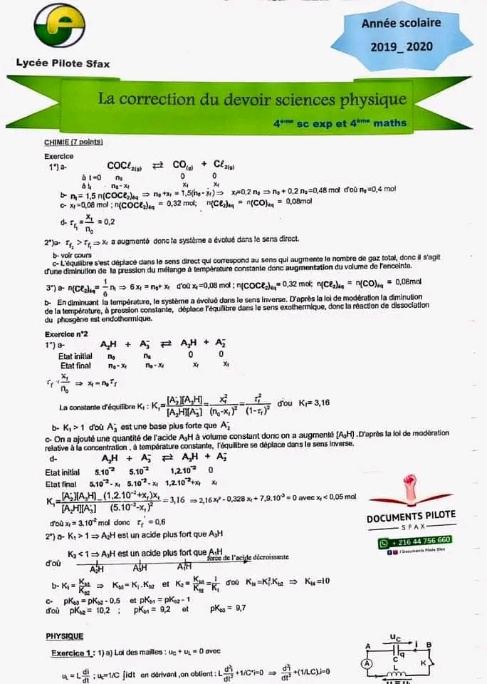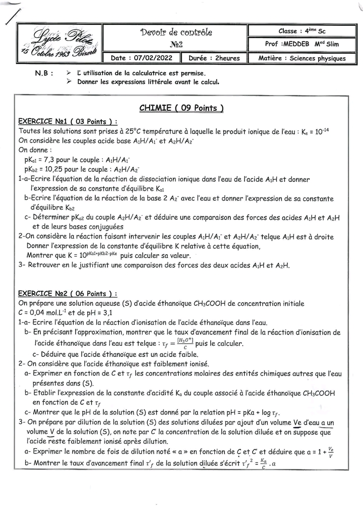 # **Devoir de contrôle N°2 Physique + corrigé**