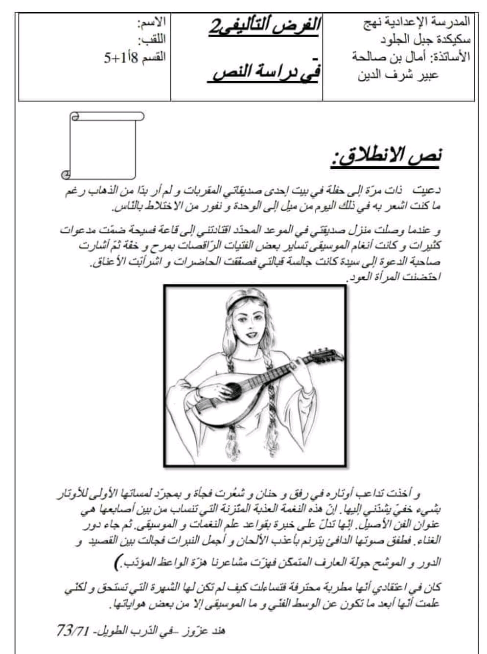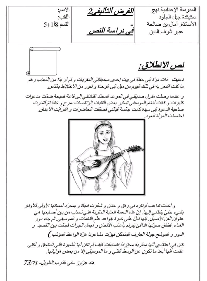 فروض تأليفية عدد 2 في مادة قراءة وفهم بالاصلاح