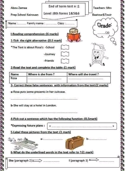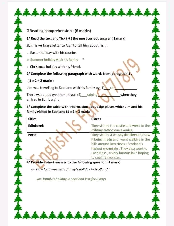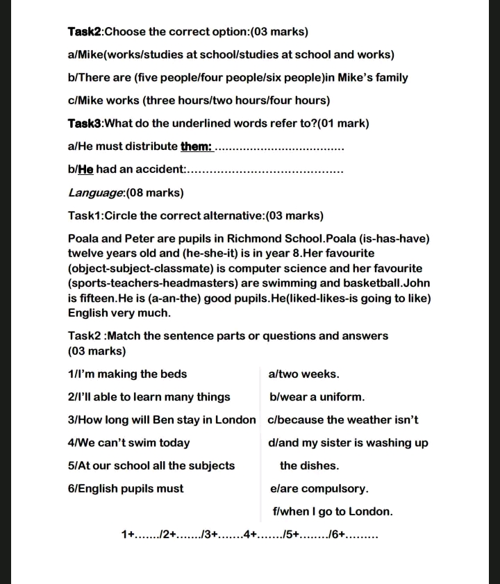 Content: .............../2 ; spelling and punctuation: ................./2 ; grammar: ................/2