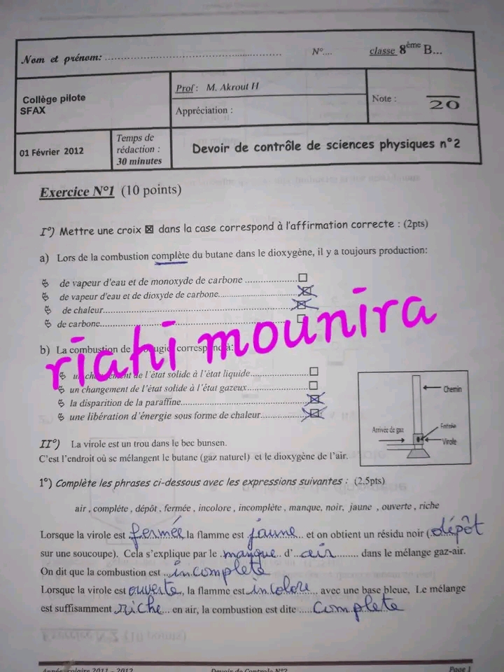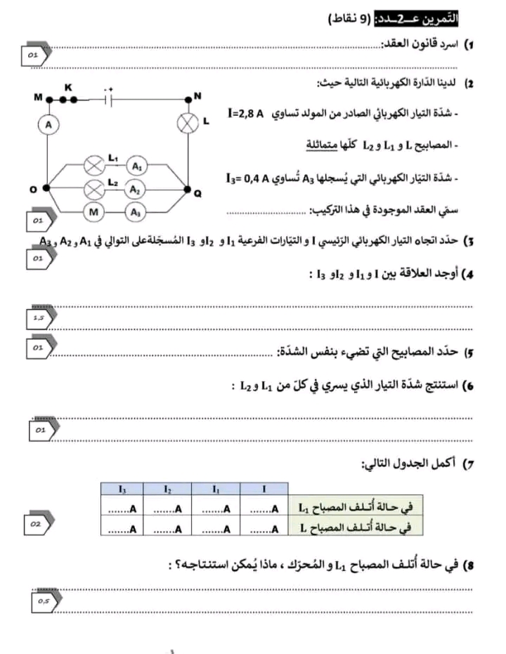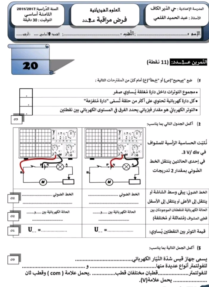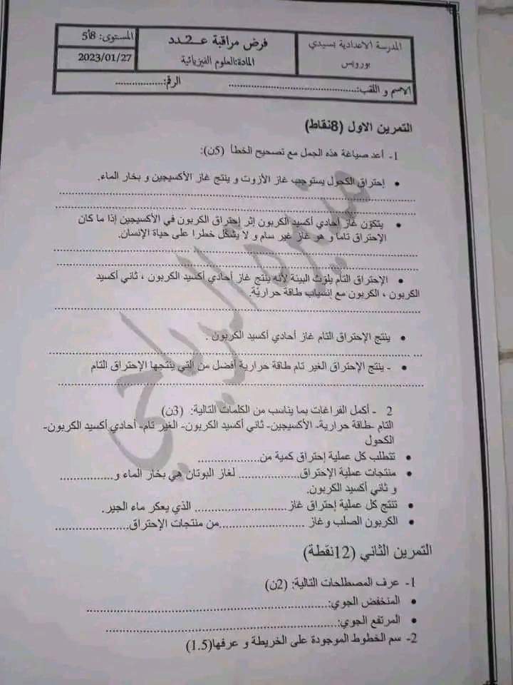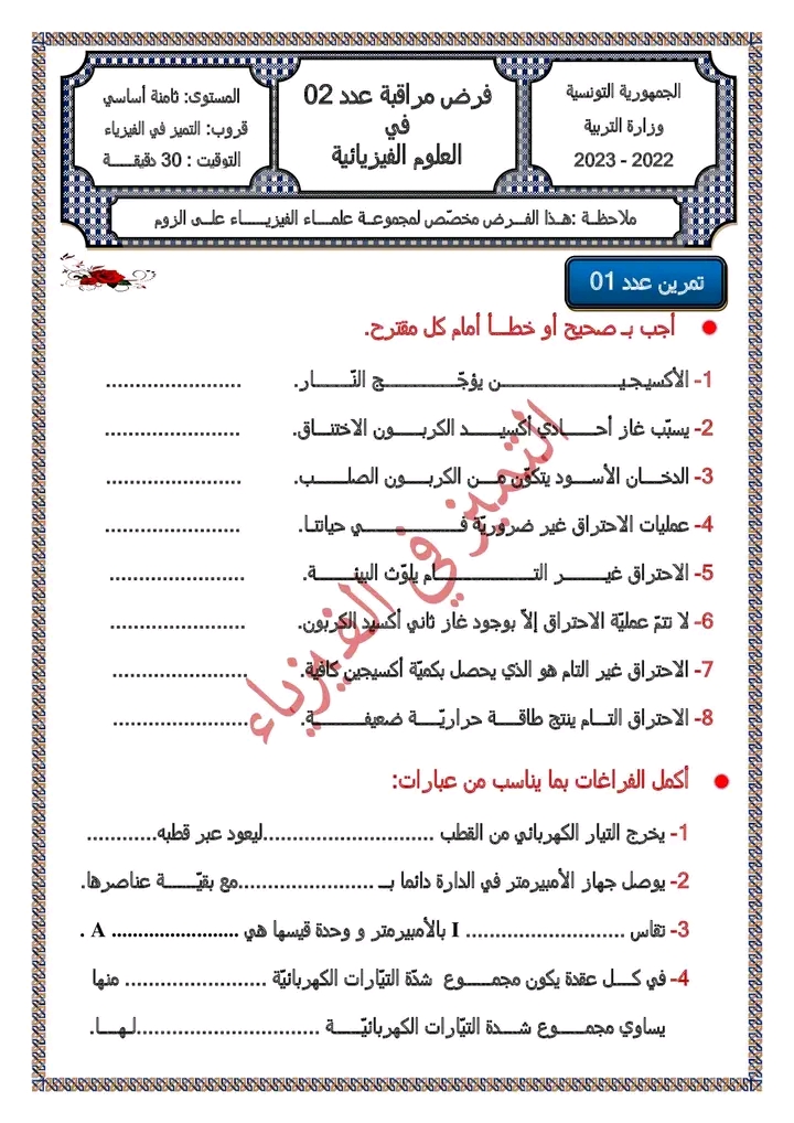 فروض مراقبة عدد 2 في مادة العلوم الفيزيائية بالاصلاح