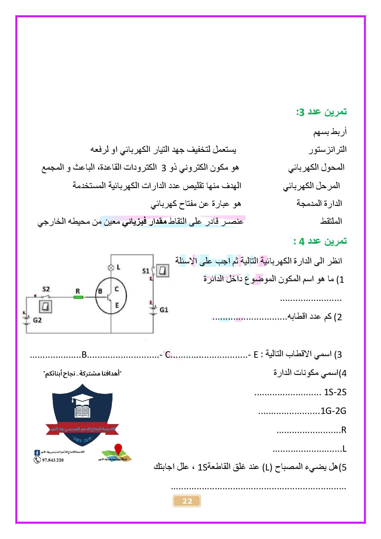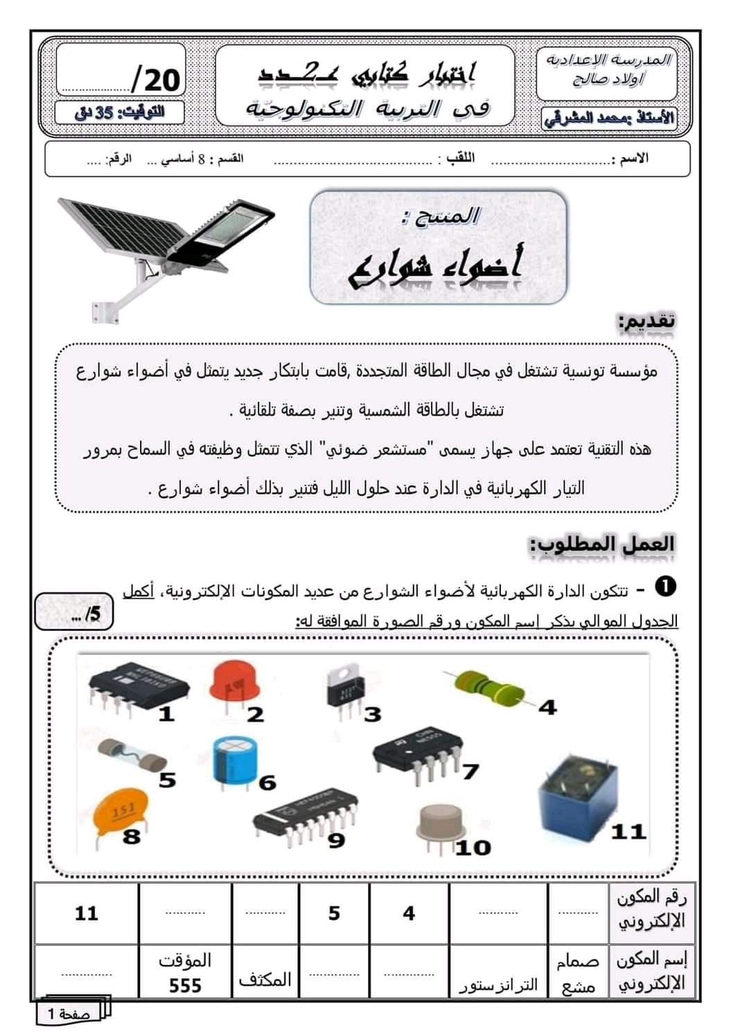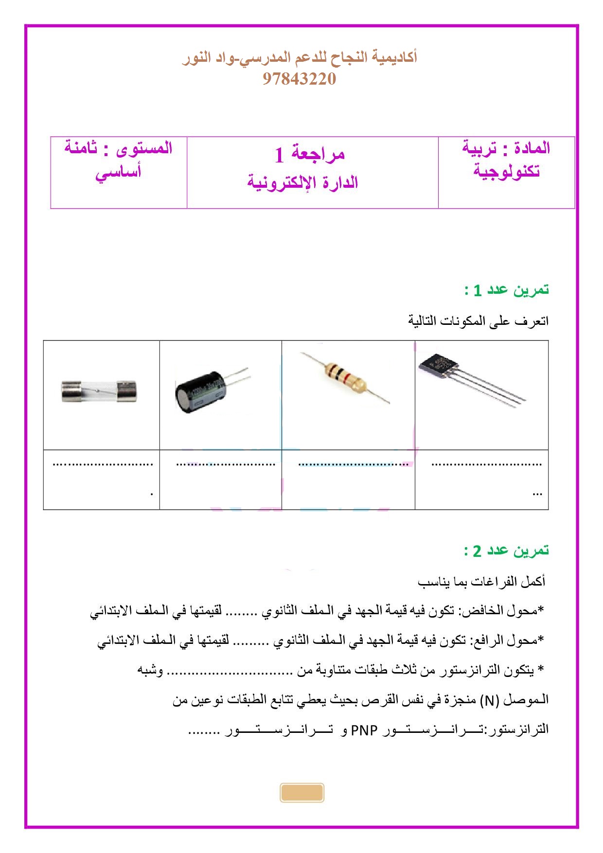 تمارين مراجعة تربية تكنولوجية بالاصلاح حول الدارة الكهربائية سنة ثامنة