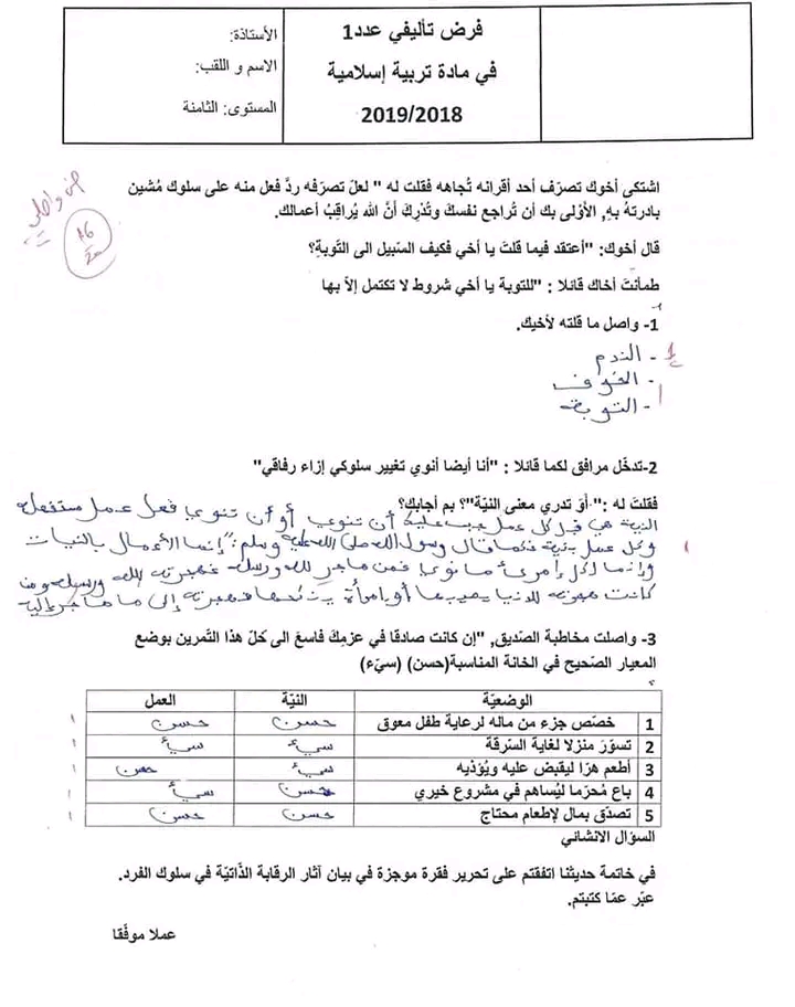 سنة ثامنة فرض تأليفي عدد1في التربية الإسلامية