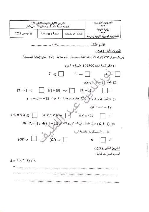 فرض تأليفي عدد 1 مع الإصلاح المستوى 8 أساسي رياضيات جهوي سوسة 2024