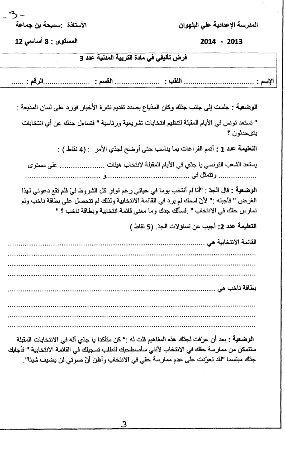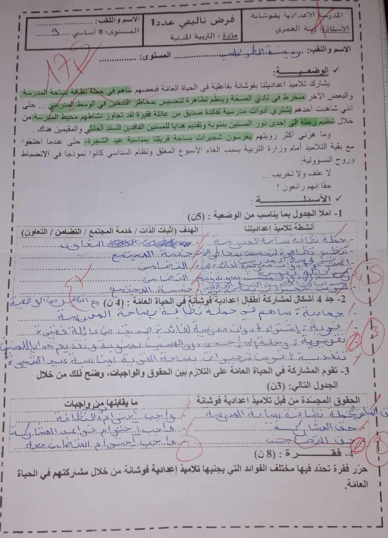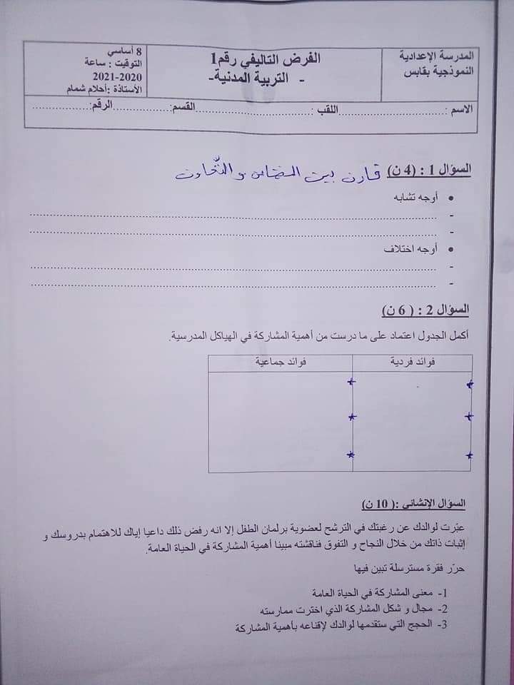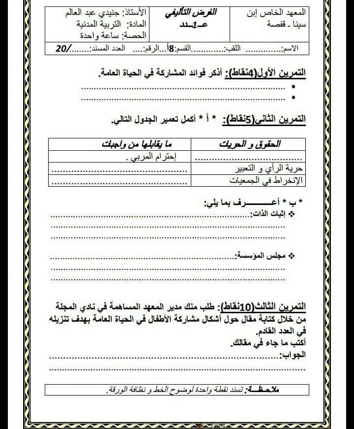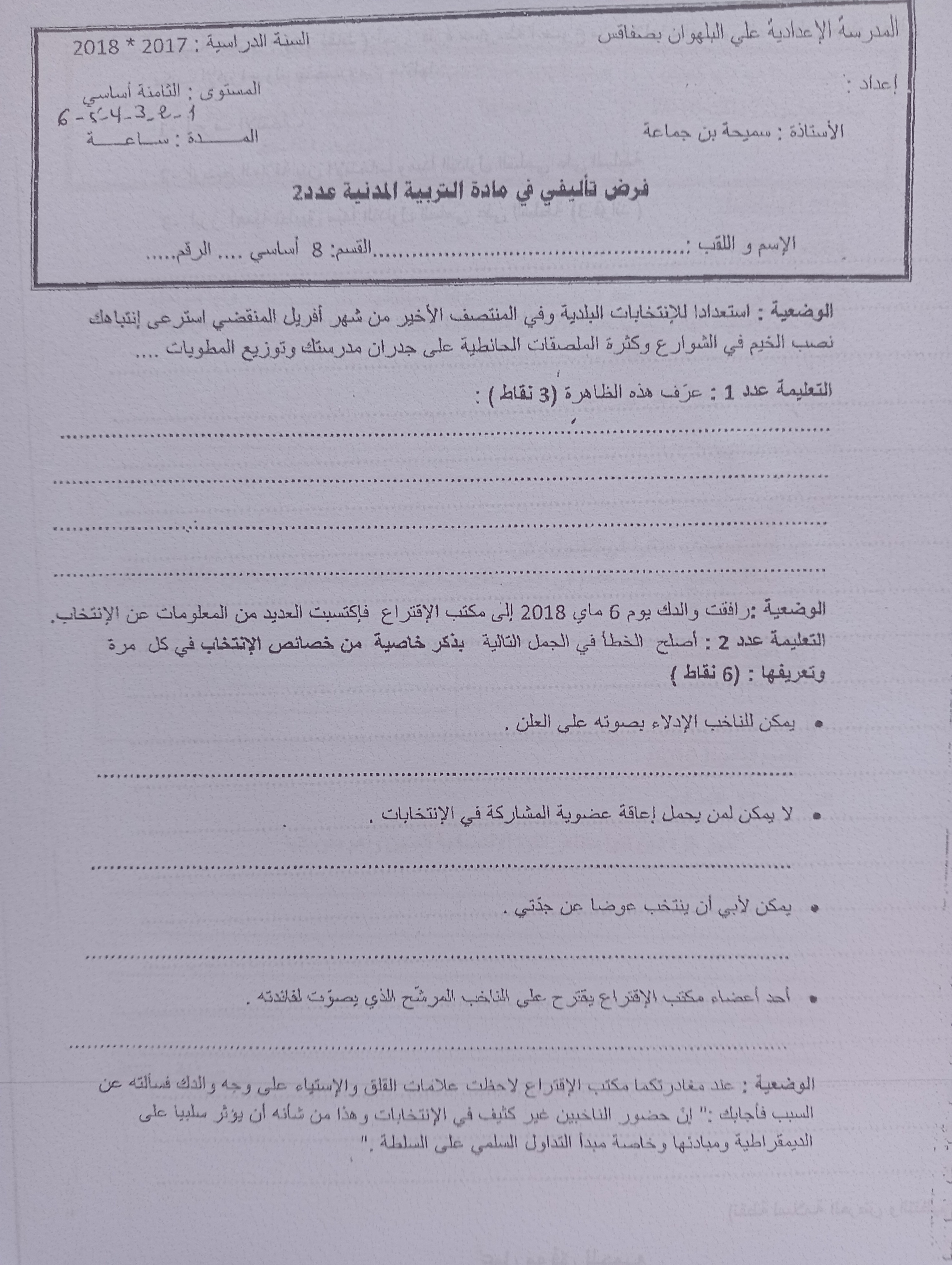 إجابات فرض تأليفي في مادة التربية المدنية عدد 2