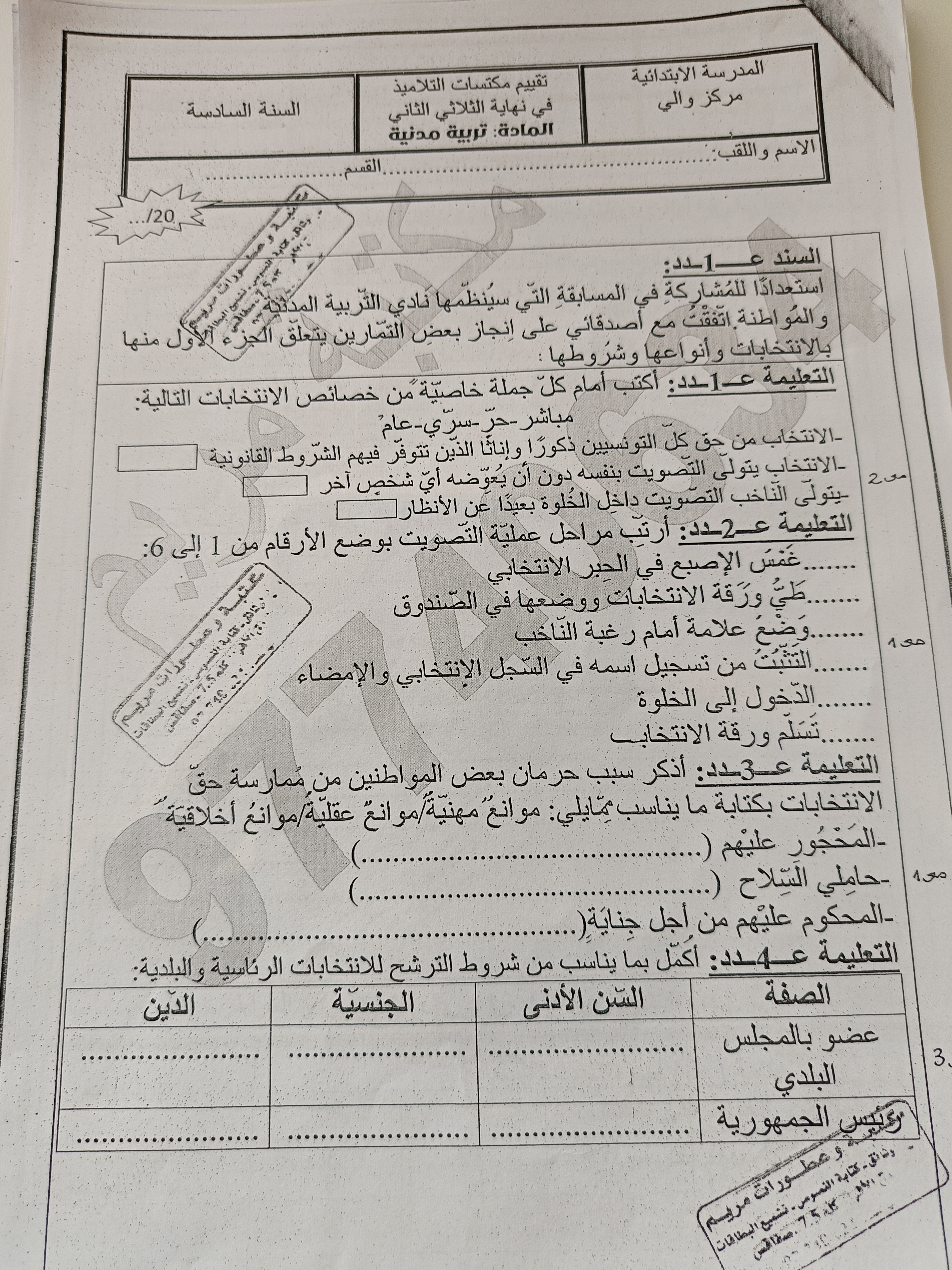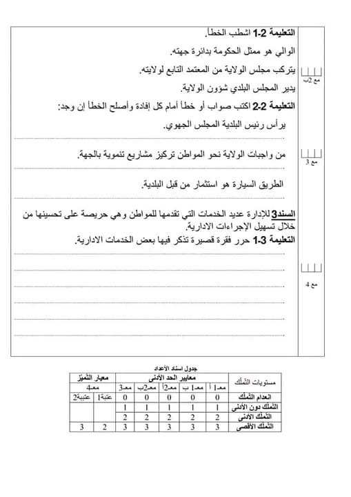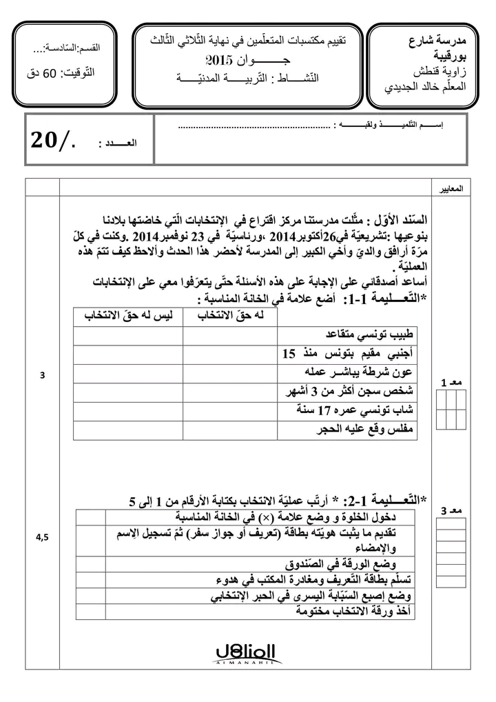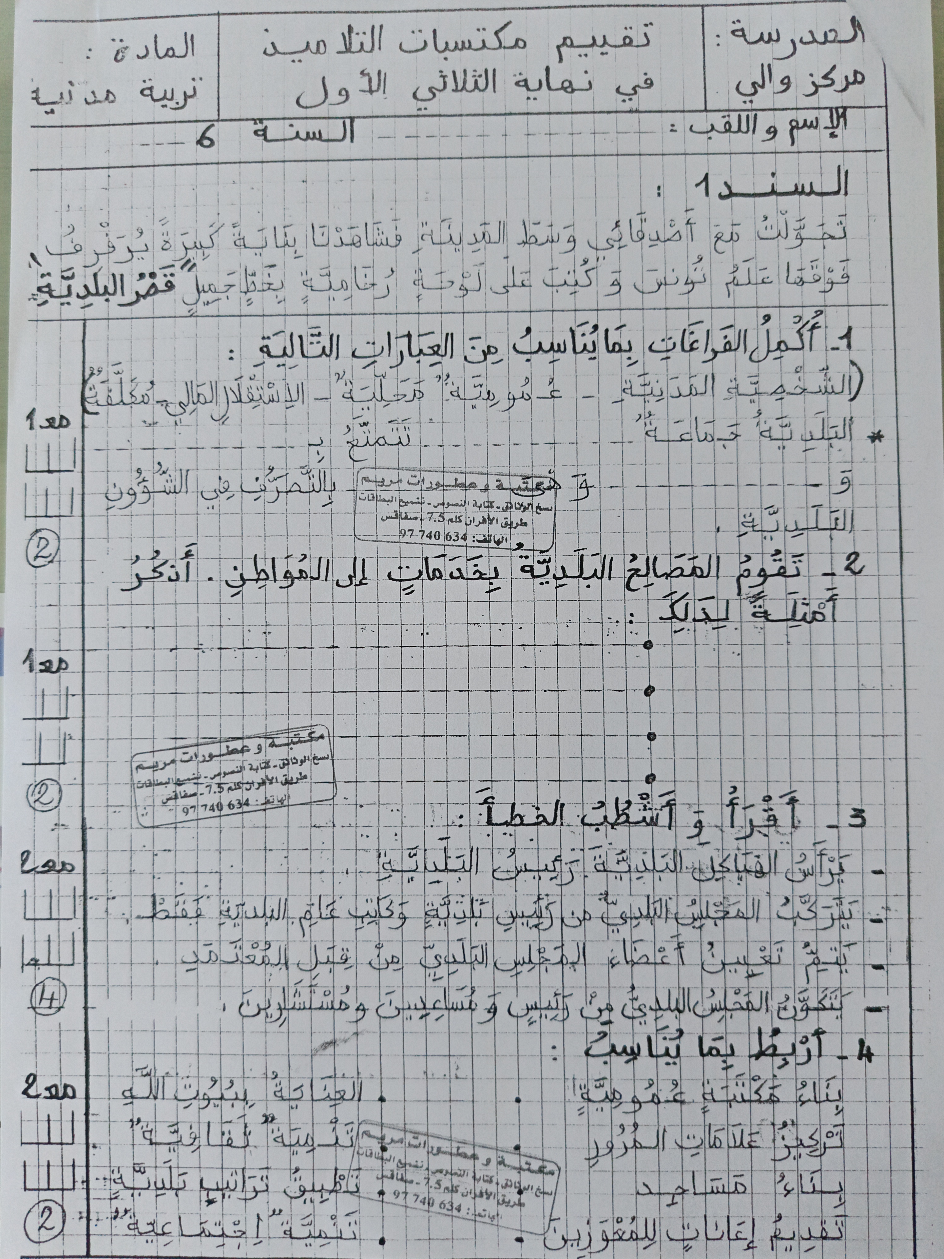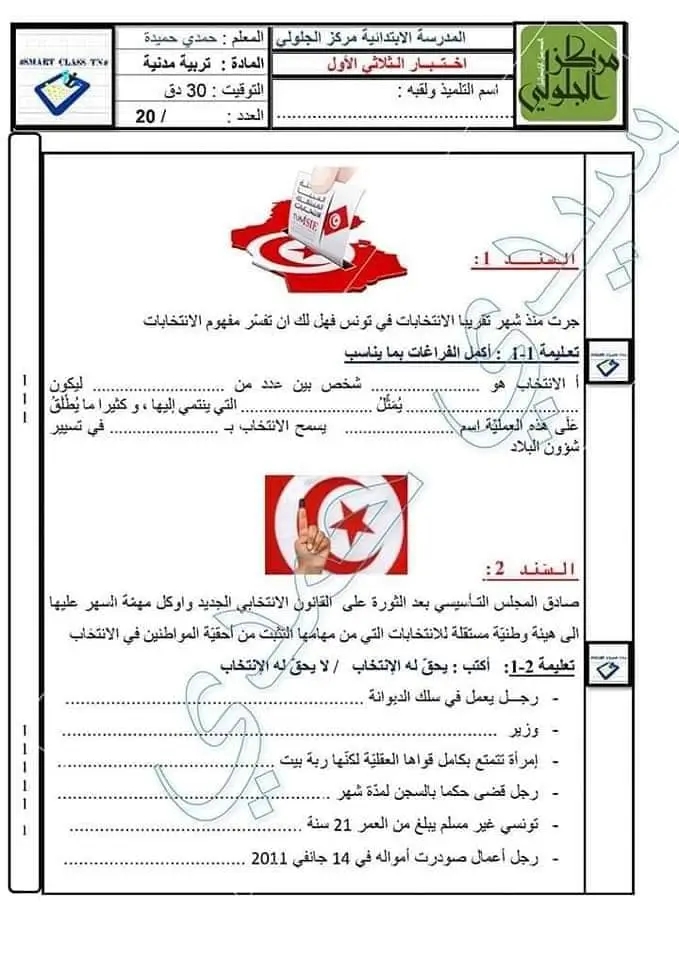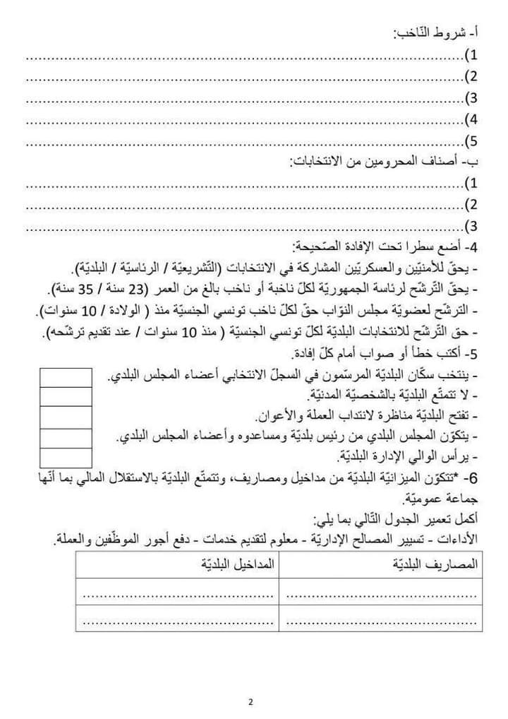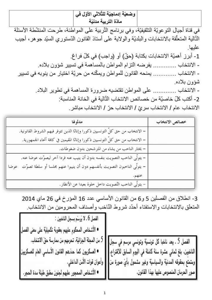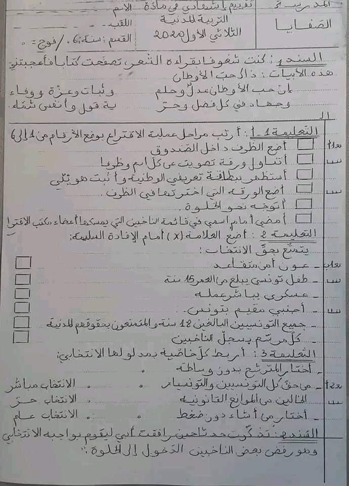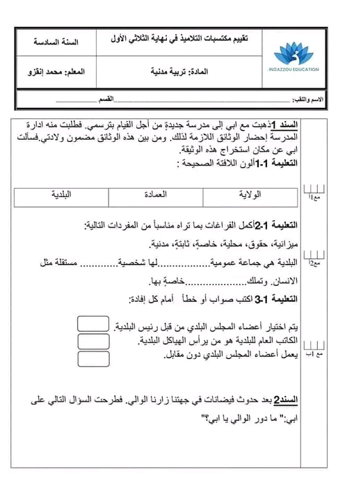 اختبارات تربية مدينة سنة سادسة الثلاثي الاول