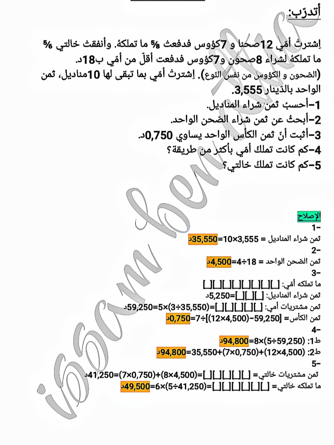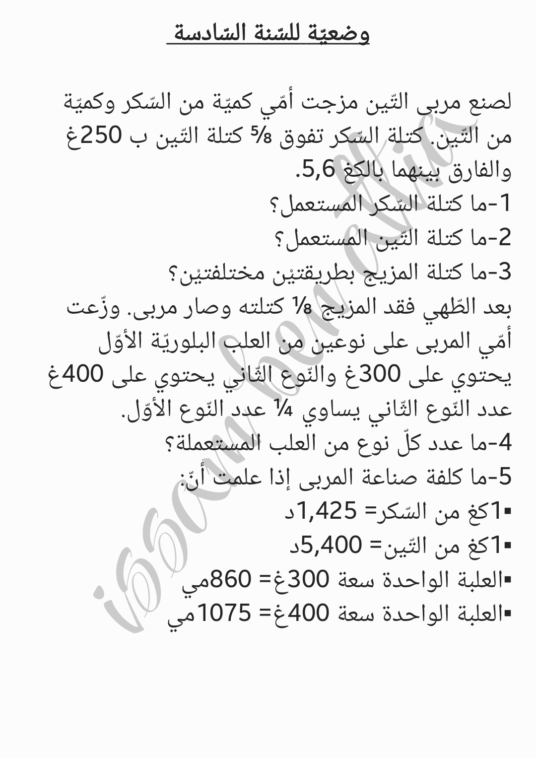 تقييم قبلي نموذجي بالاصلاح سنة سادسة في الرياضيات