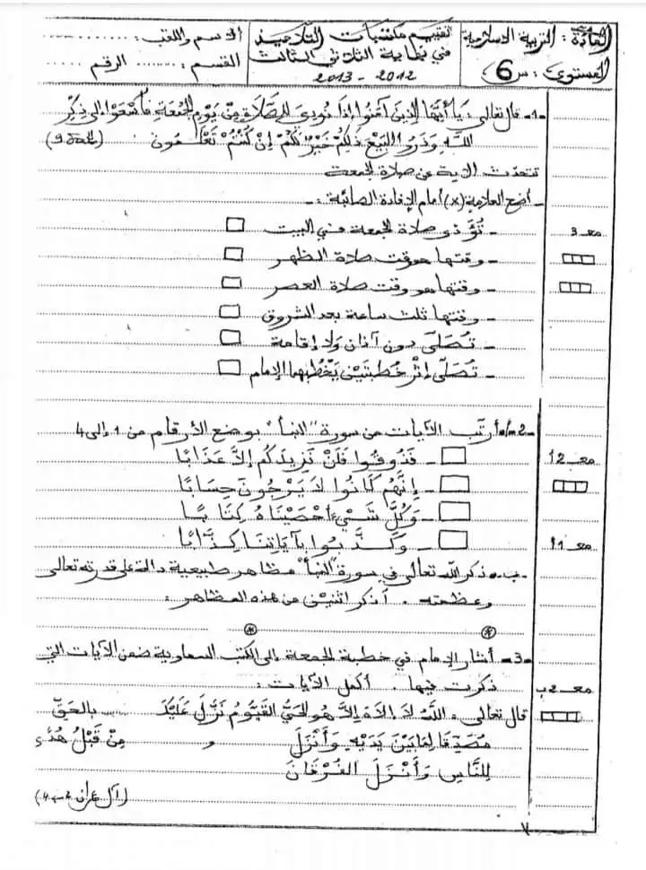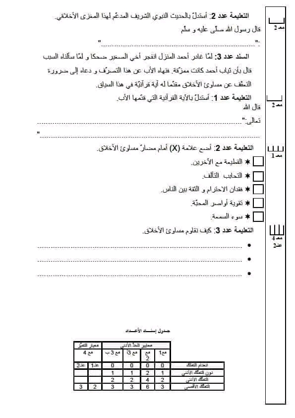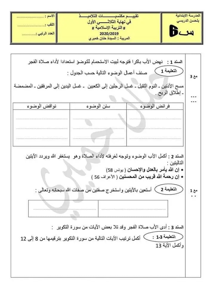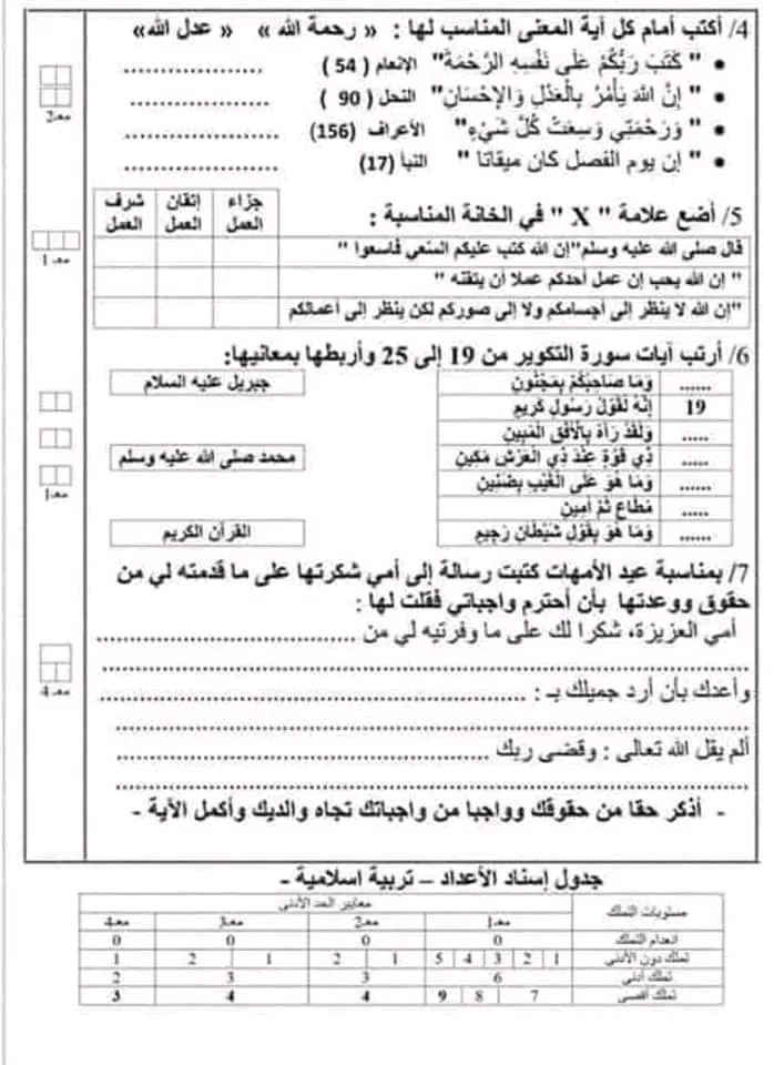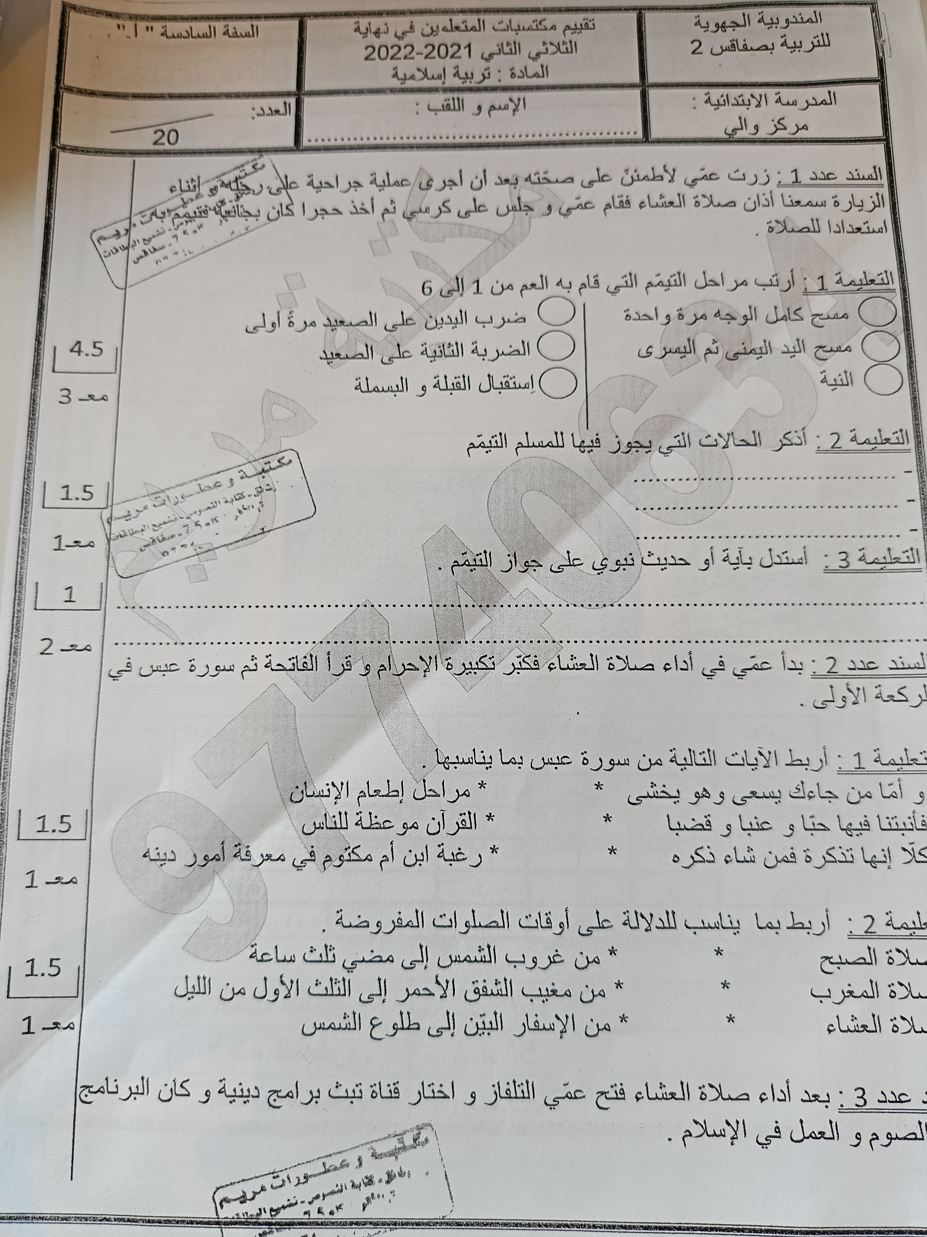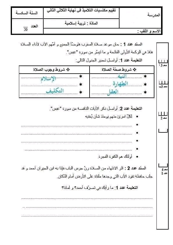 تقاييم تربية إسلامية الثلاثي الثاني سنة سادسة