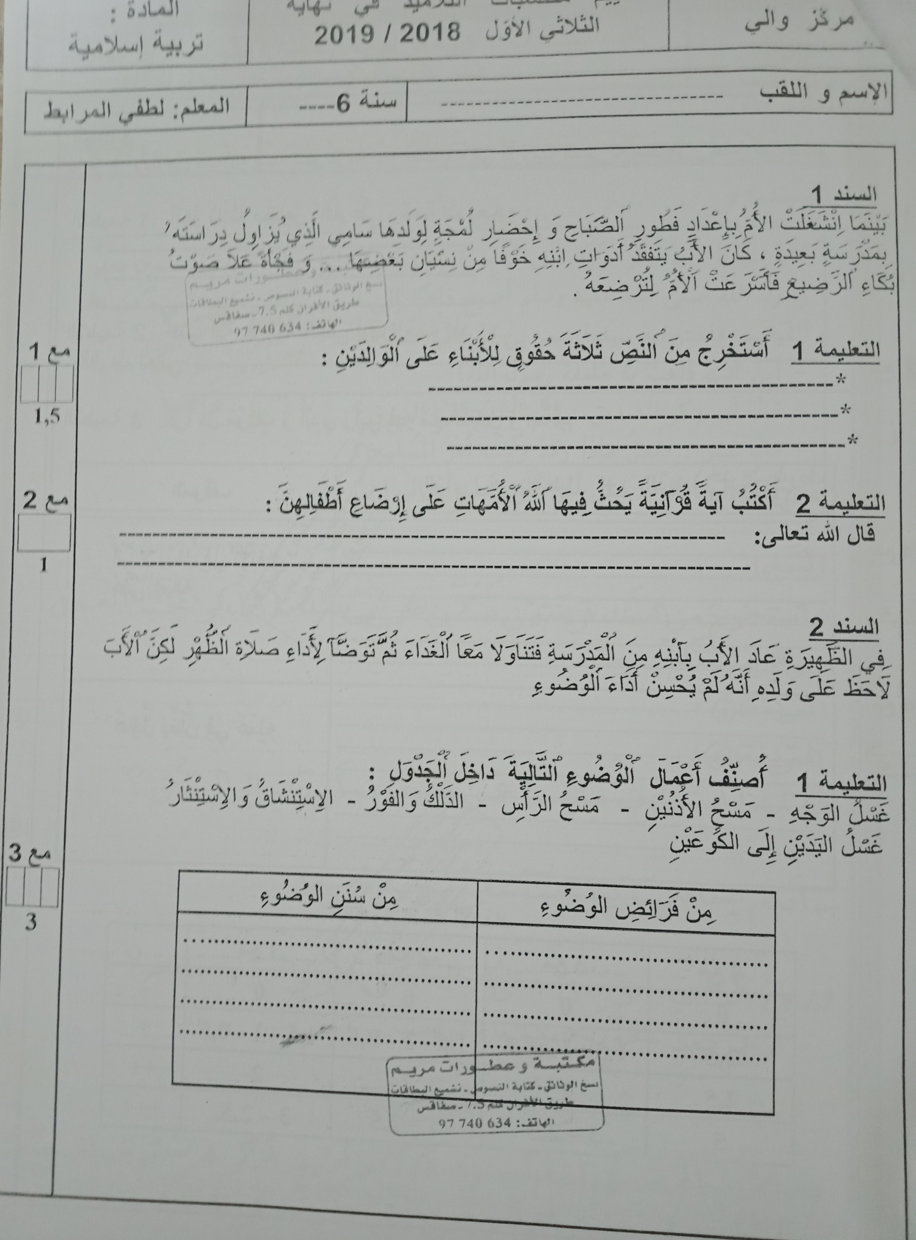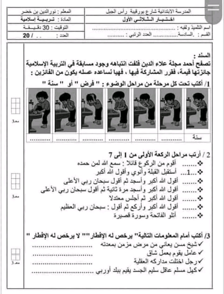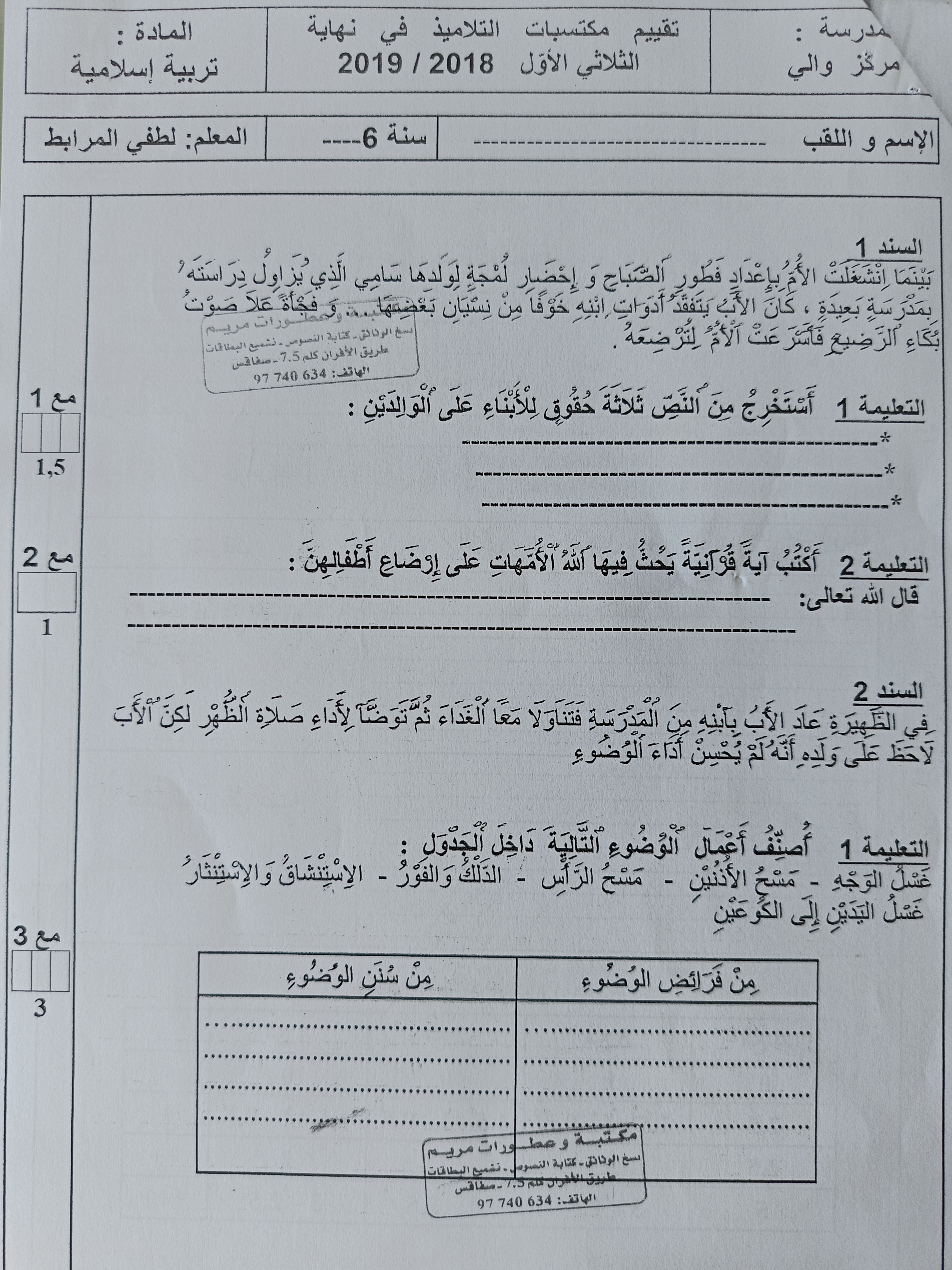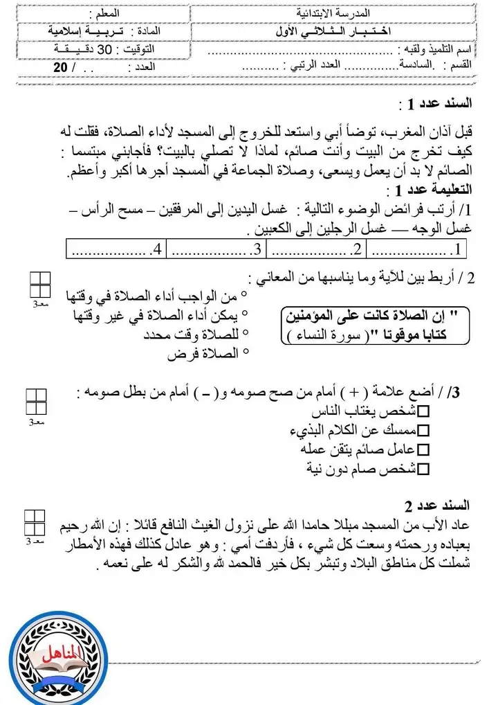 اختبارات تربية إسلامية الثلاثي الأول سنة سادسة