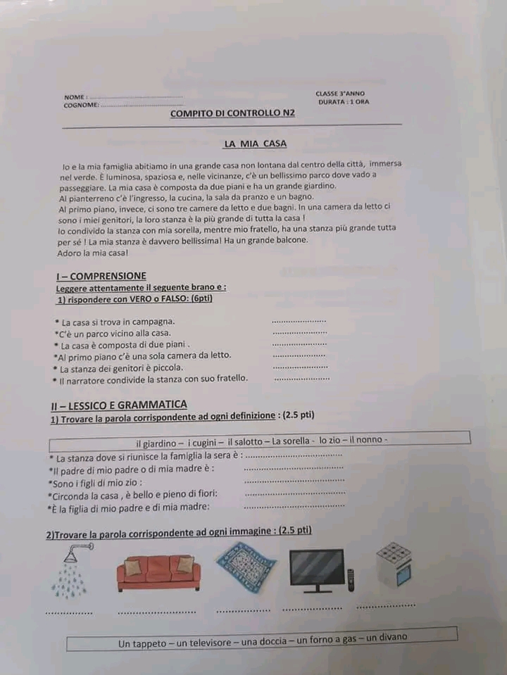 Devoirs de contrôle Italien trimestre 2