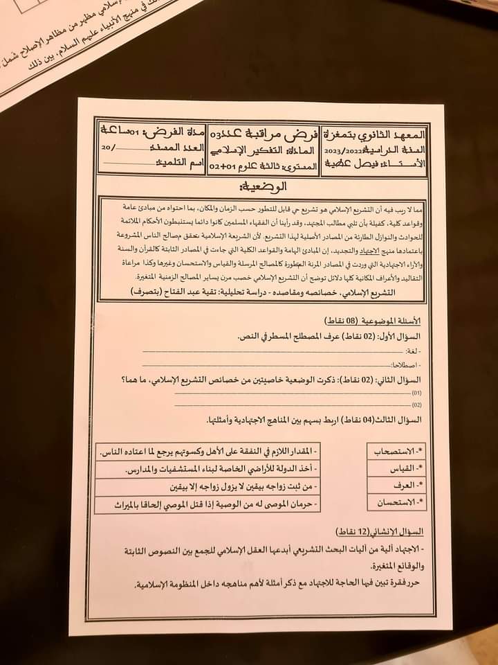 فرض مراقبة رقم 01 تفكير اسلامي للثالثة شعب علمية