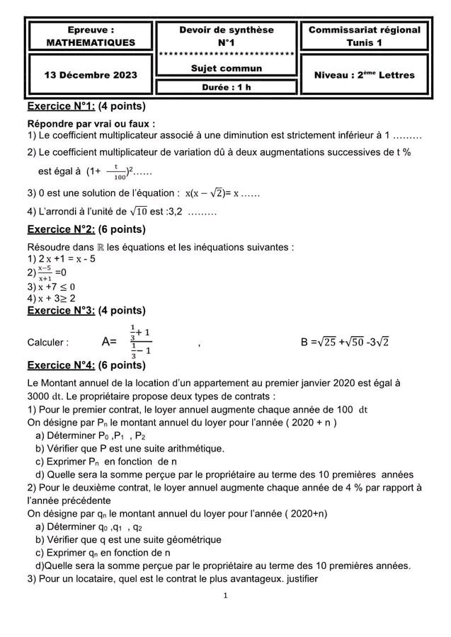 Devoirs de synthèse Math trimestre 1
