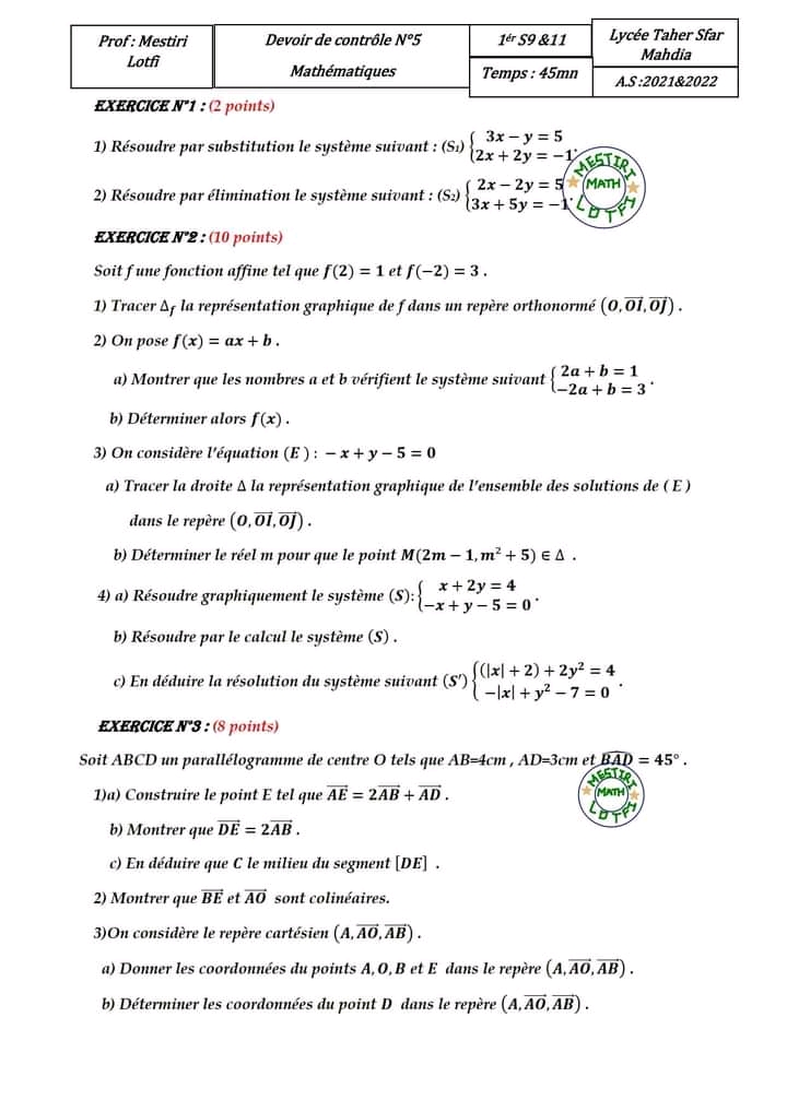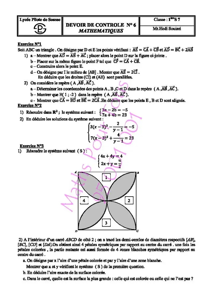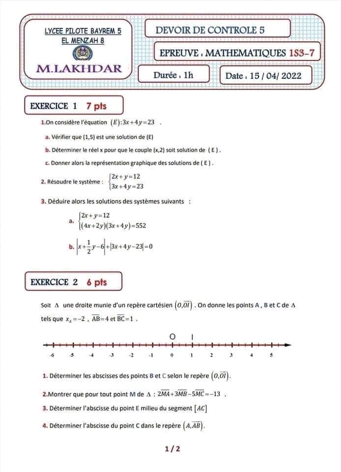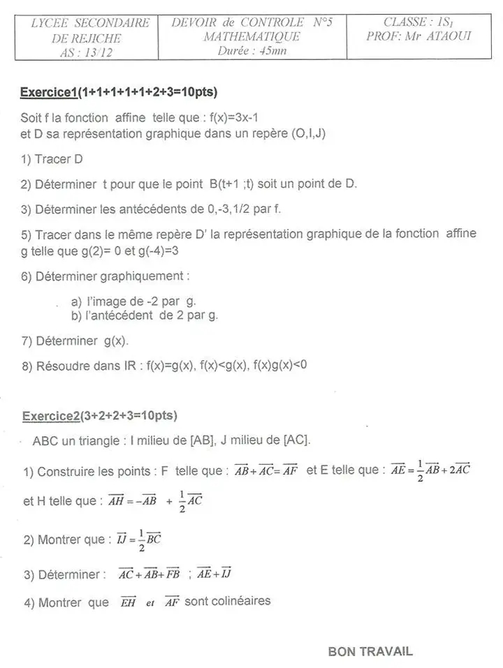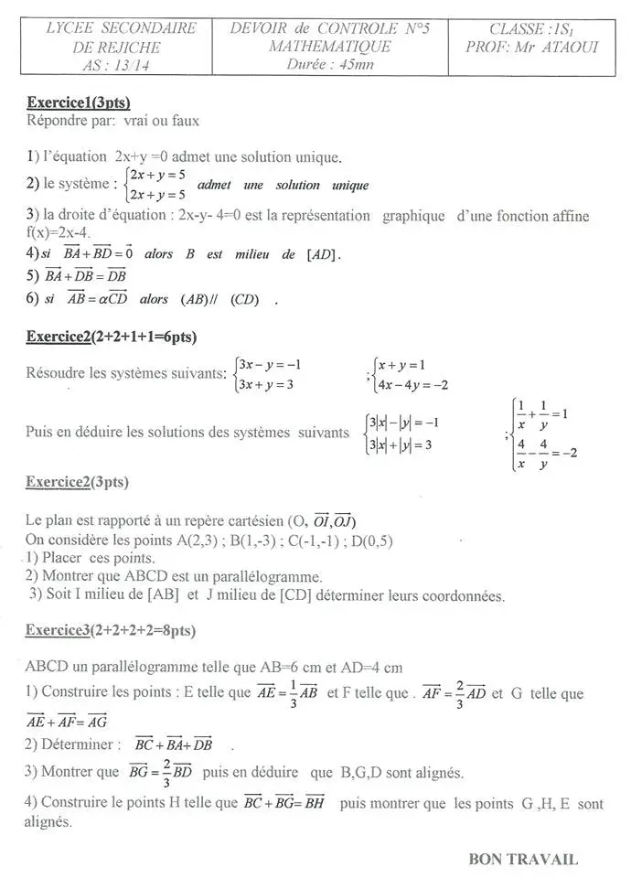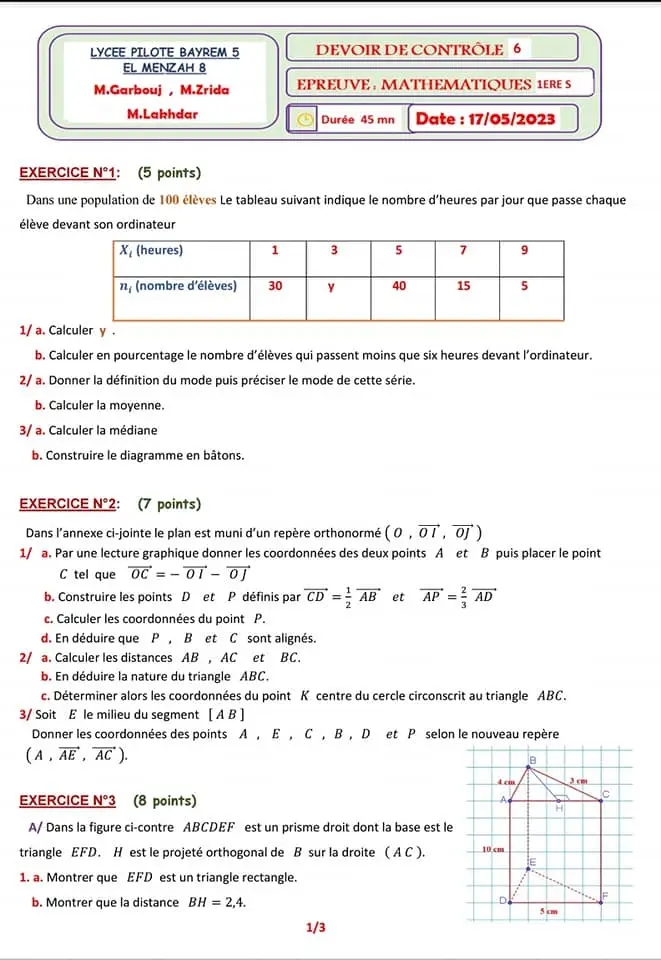 Devoir de contrôle n°5 mathématiques pilote avec correction