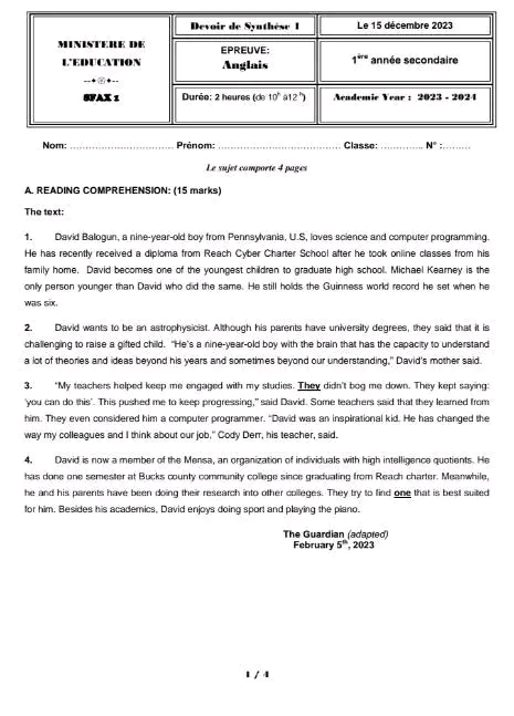 Devoir de synthèse n 1 anglais+correction