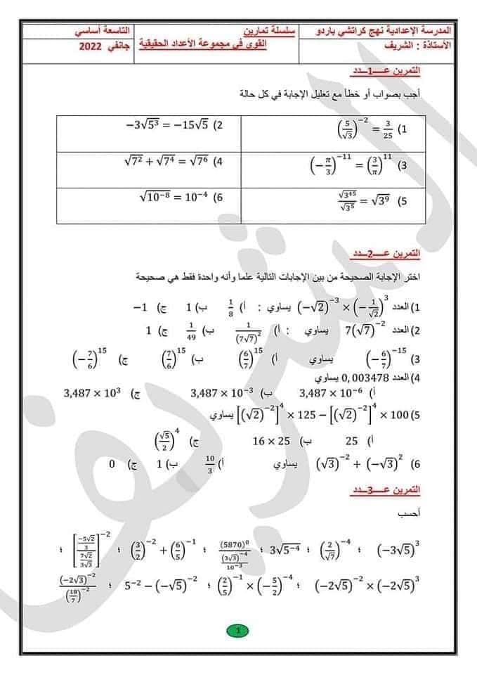 سلسلة تمارين سنة تاسعة اساسي