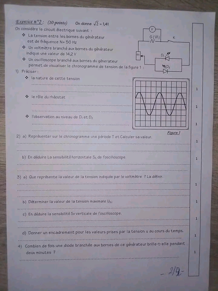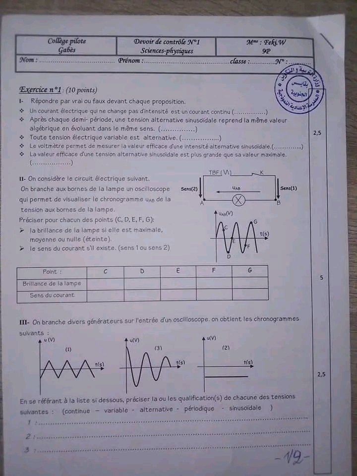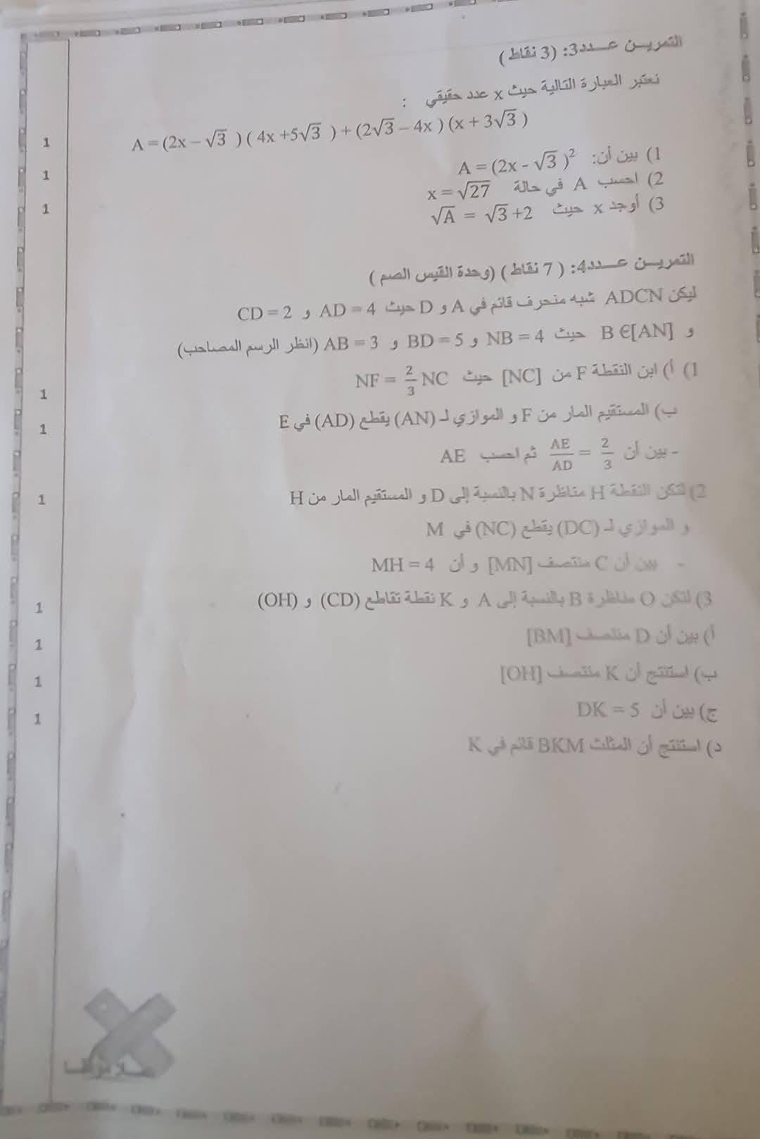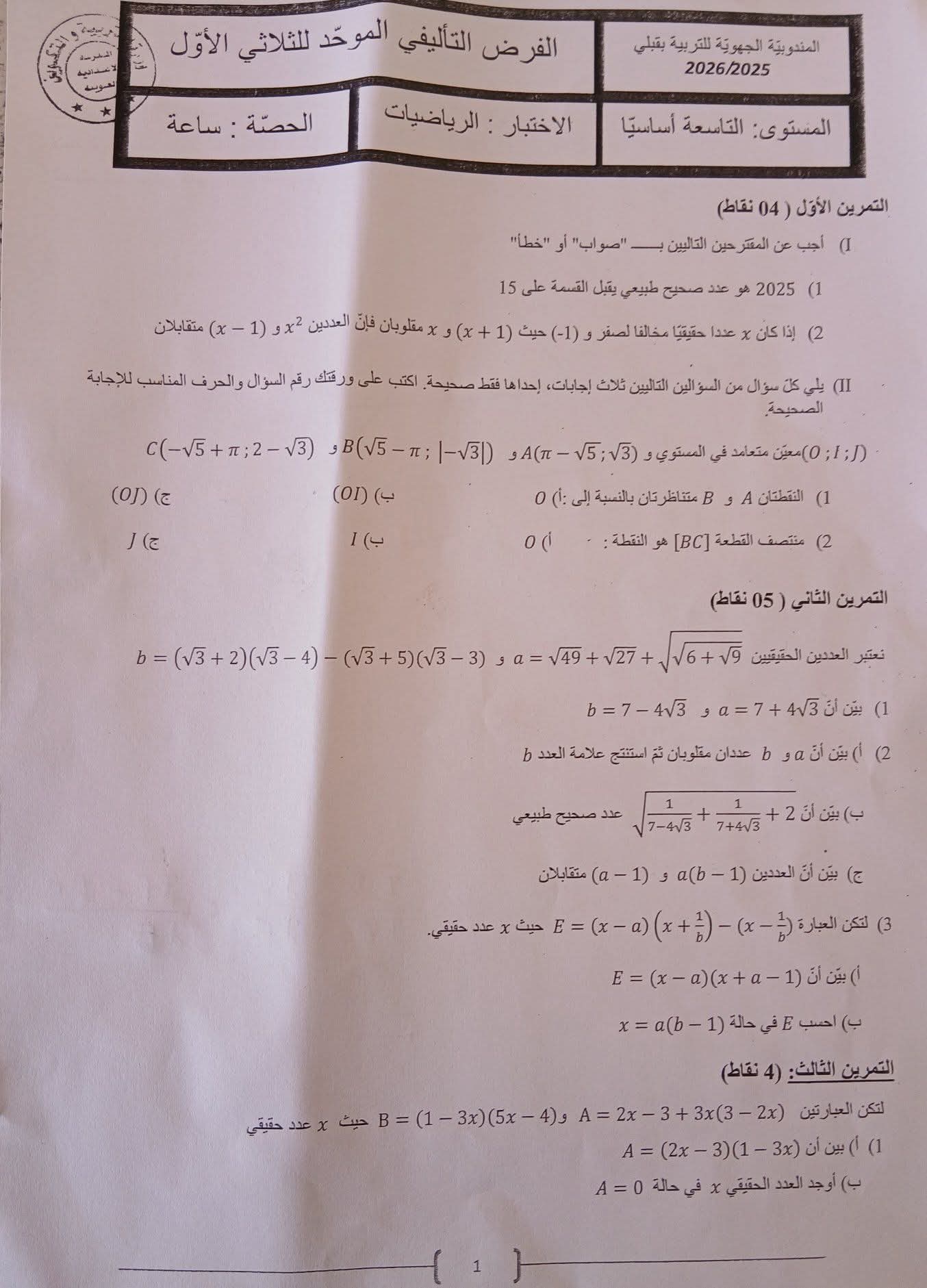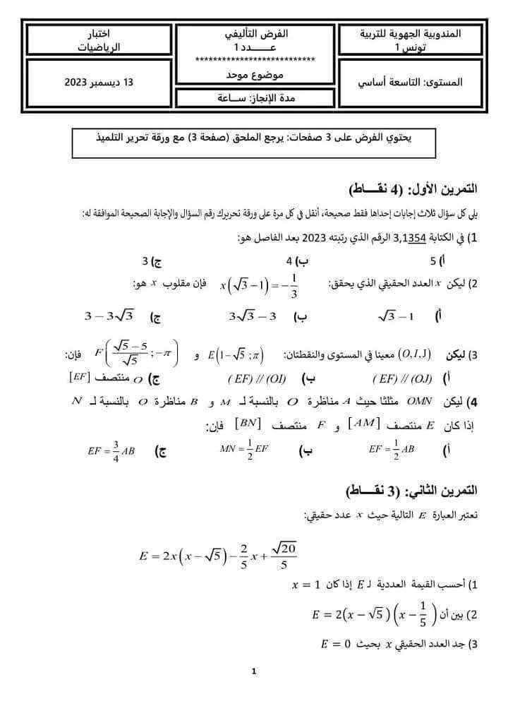 الفرض الموحد للثلاثي الأول لتلاميذ التاسعة أساسي