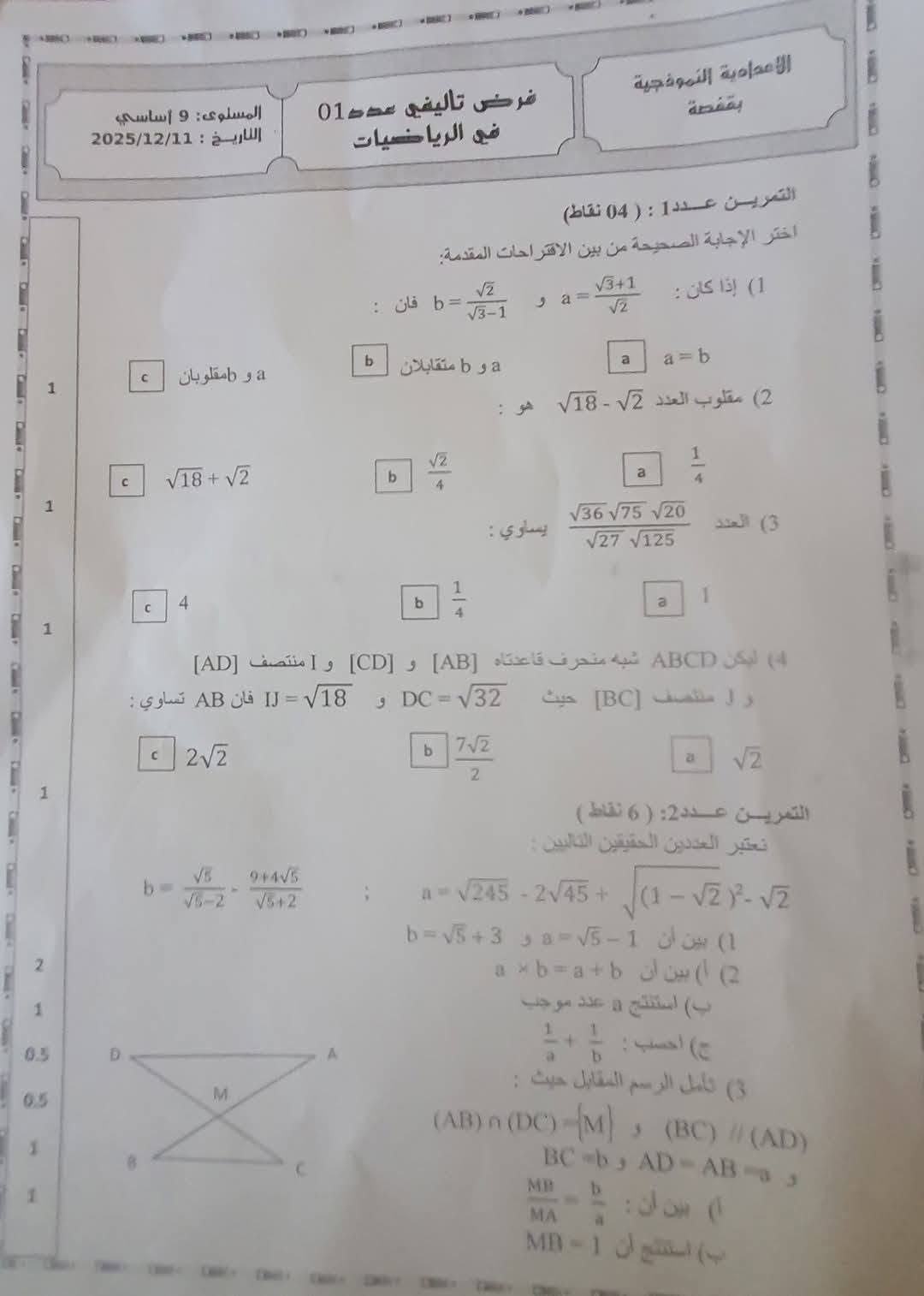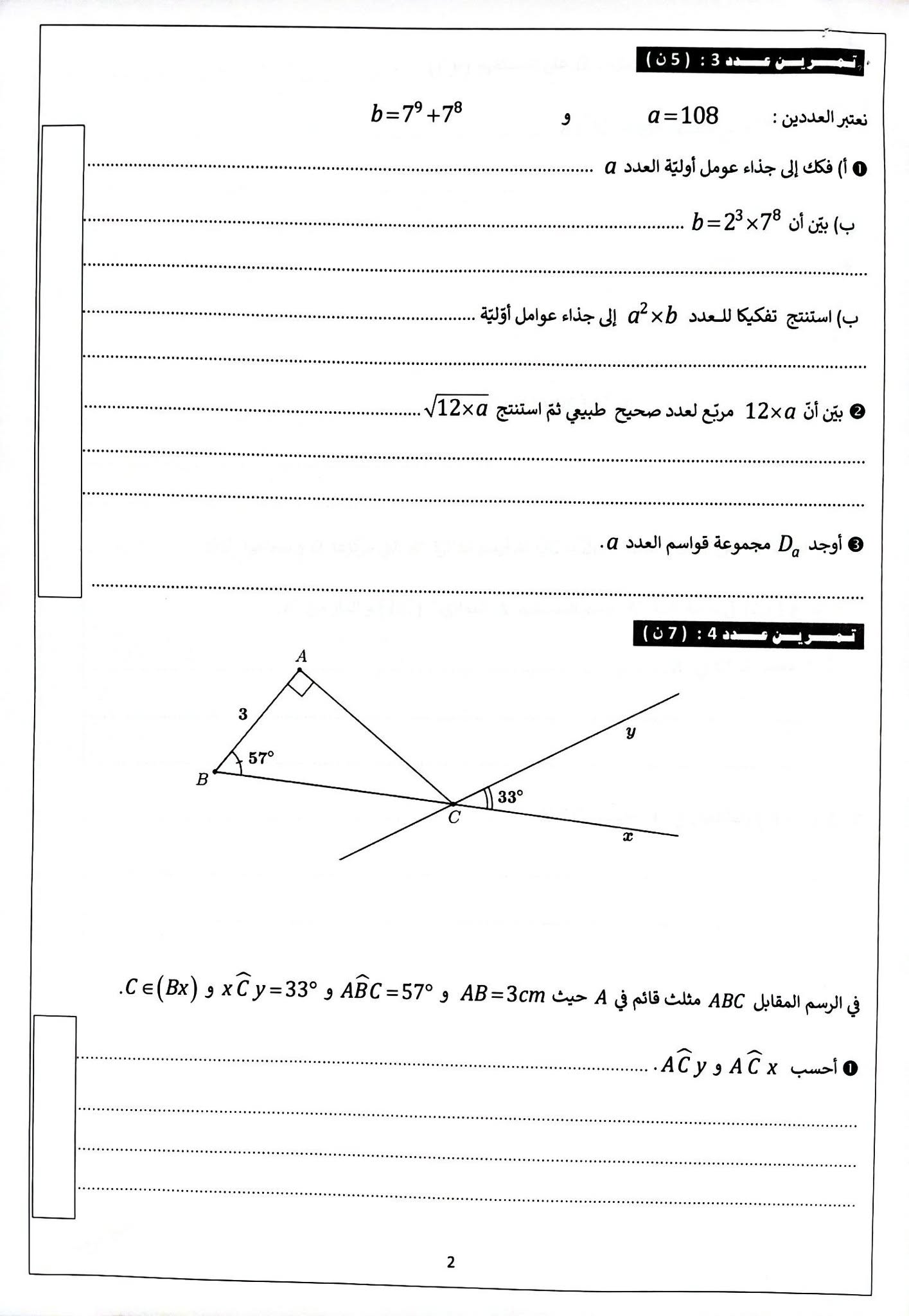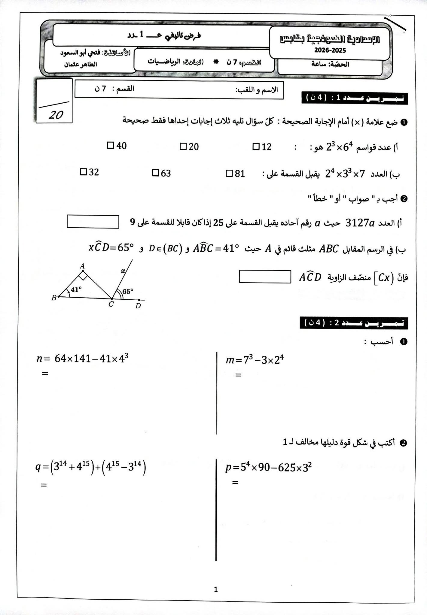 الفرض التأليفي الموحد الأول في الرياضيات للسنوات السابعة نموذجي بقابس.
