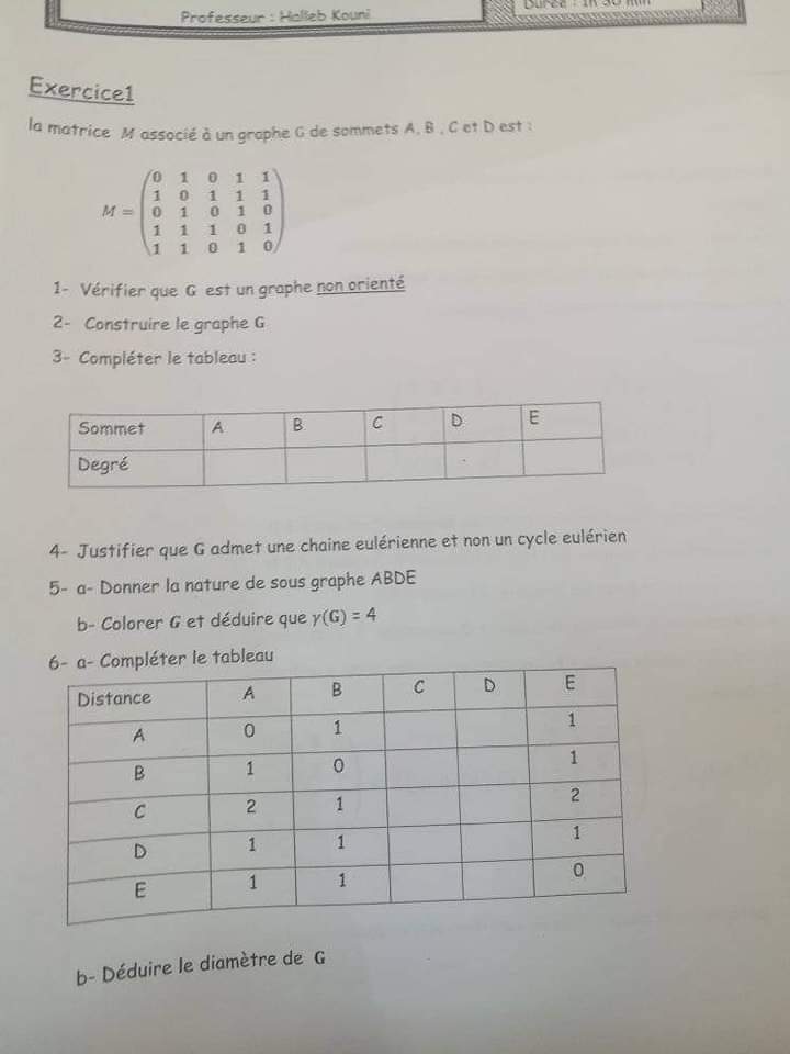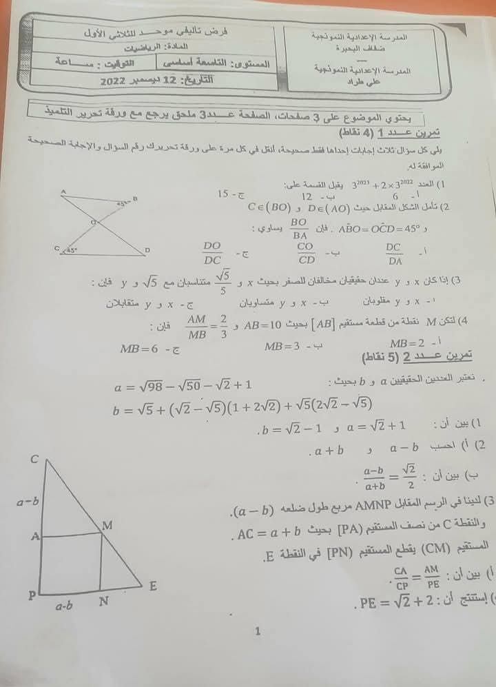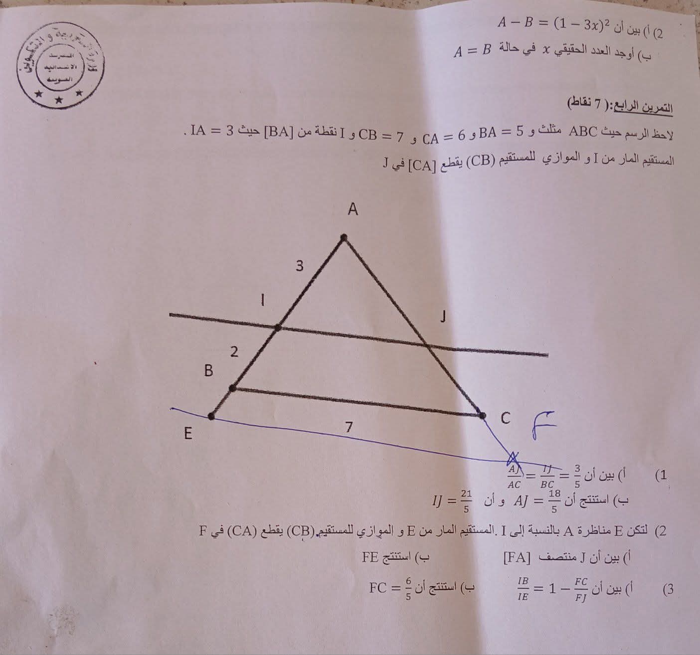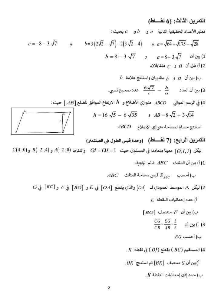 الفرض التأليفي الموحد الأول في الرياضيات للسنوات السابعة نموذجي بقابس.