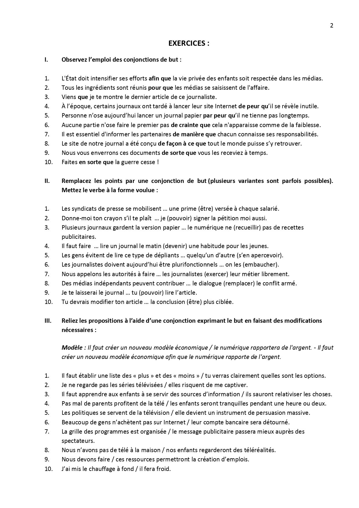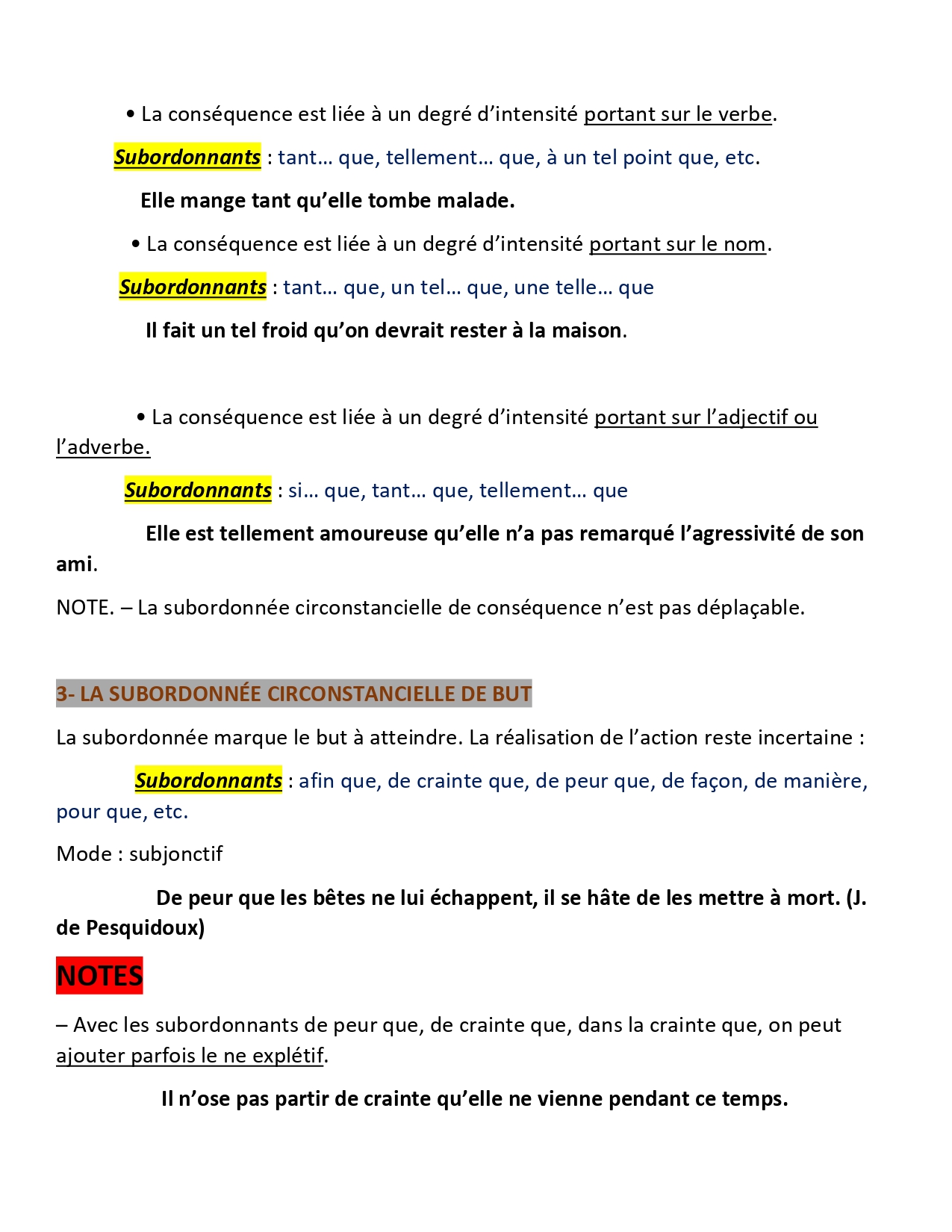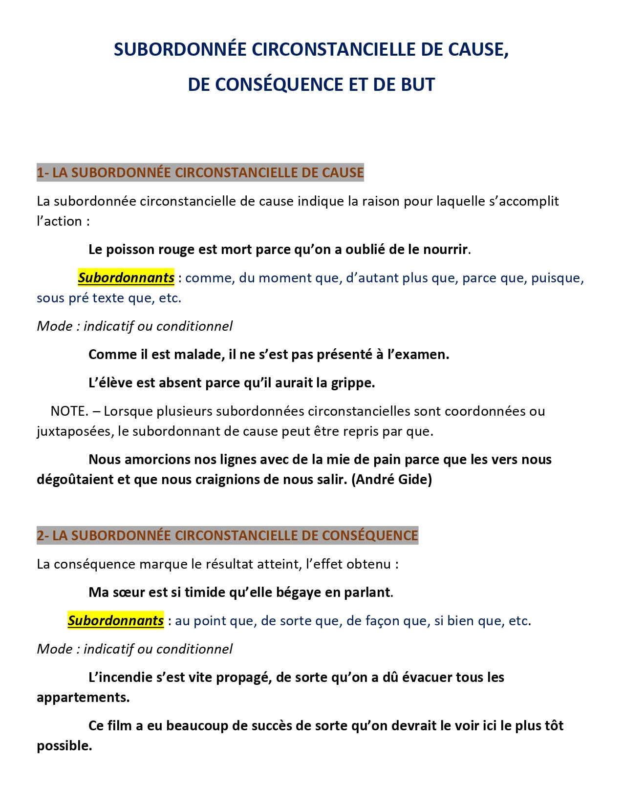Leçon exercices corrigés : La subordonnée circonstancielle de cause, de conséquence et de but.