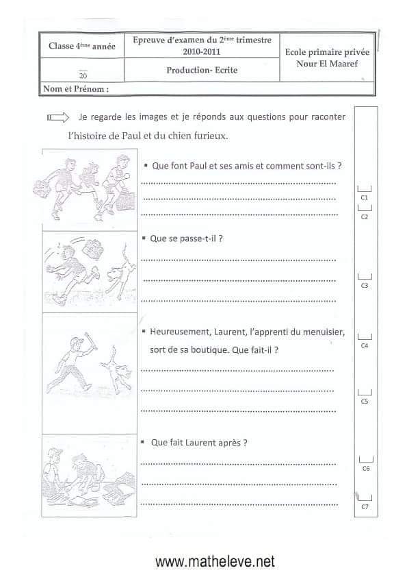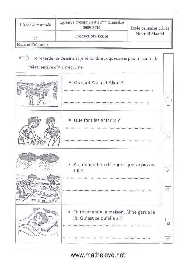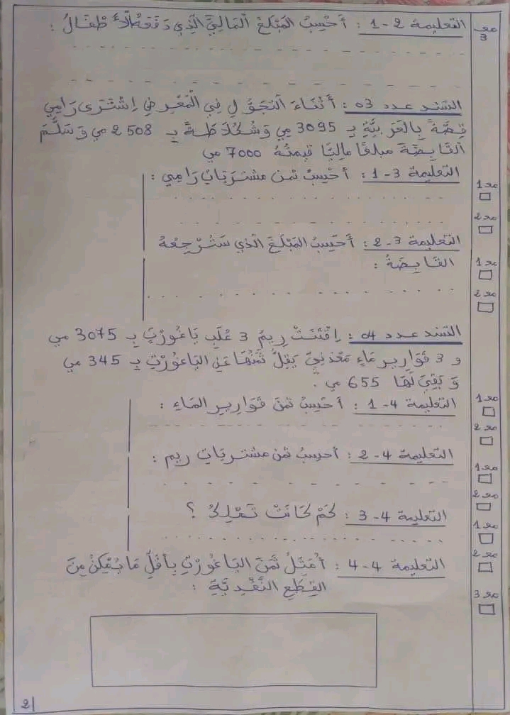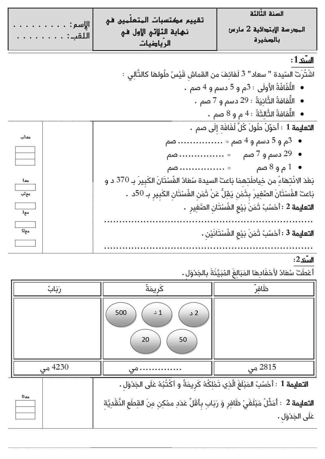 اختبار رياضيات سنة ثالثة الثلالثي الاول