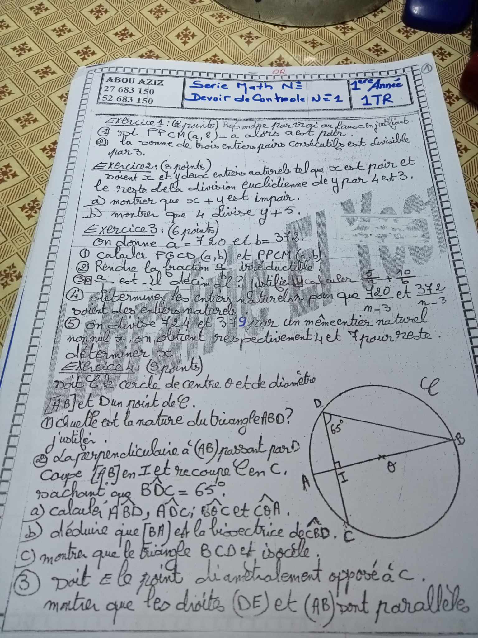 Devoir de controle math n°11ere annee