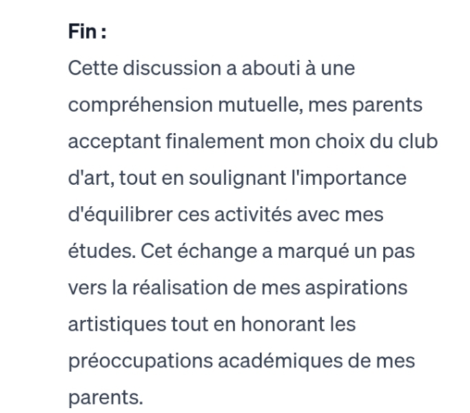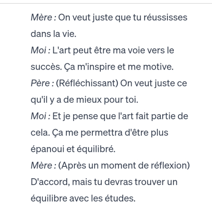 Production écrite :Sujet: pendant une réunion familiale tu as demandé la permission de tes parents de t'inscrire dans un club d'art . Mais ils refusent catégoriquement .une discussion est engagée... Afficher suite