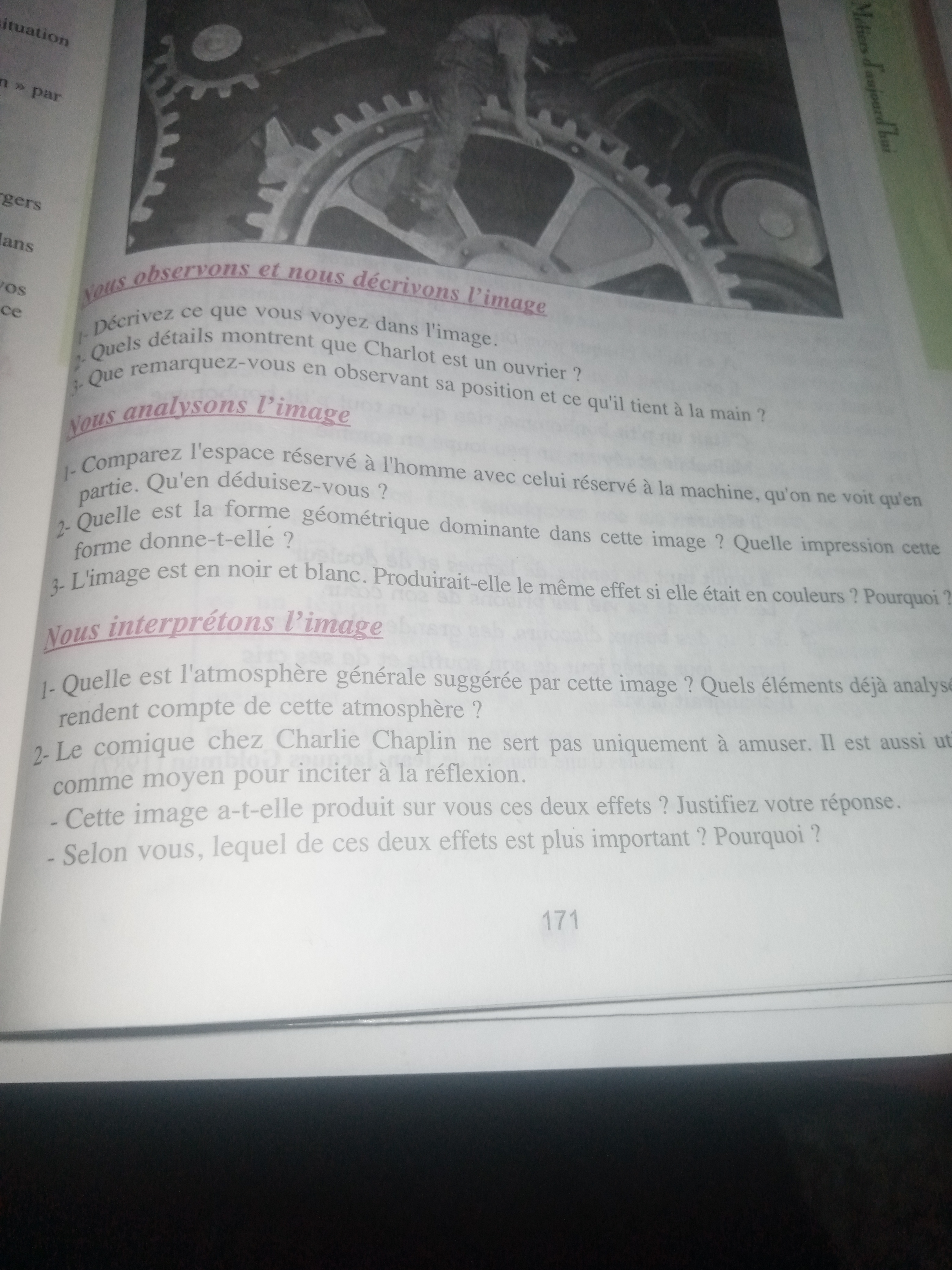 Corrige exercices page 171 manuel de français Dans l'image de Charlie Chaplin dans le film "Les Temps modernes", on peut voir Charlot coincé à l'intérieur d'une grande machine, entouré de roues ... Afficher suite