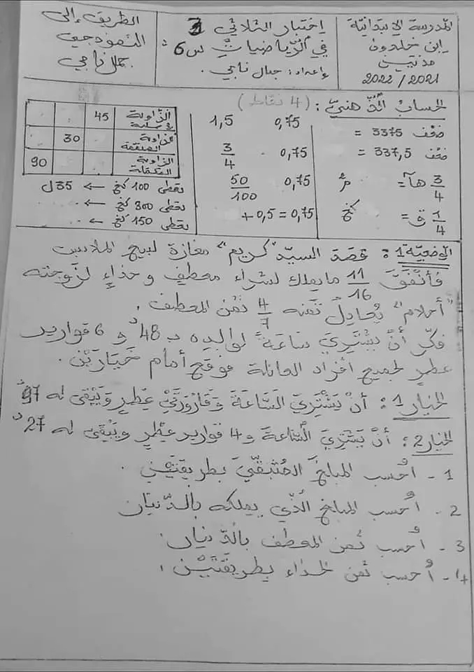 اختبار رياضيات ثلاثي ثالث سنة خامسة