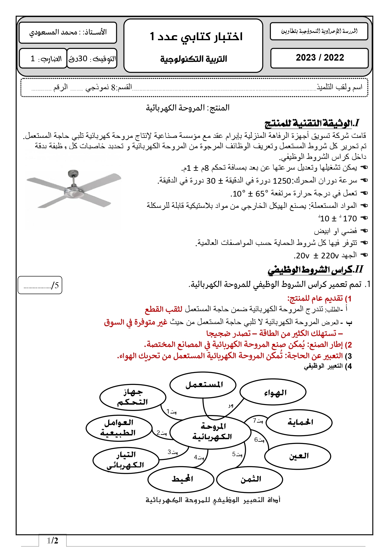 الاختبار الكتابي 1 تاسعة اساسي الاستاذ محمد المسعودي
