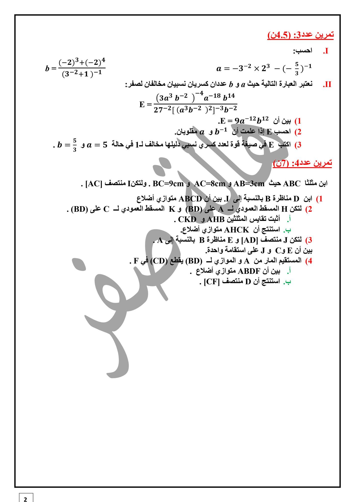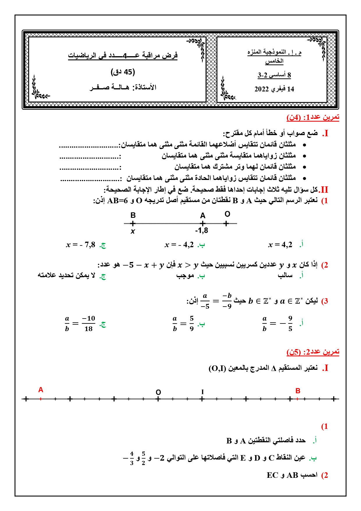 فرض مراقبة عدد 4 رياضيات ثامنة شكرا ل السيدة هالة صفر