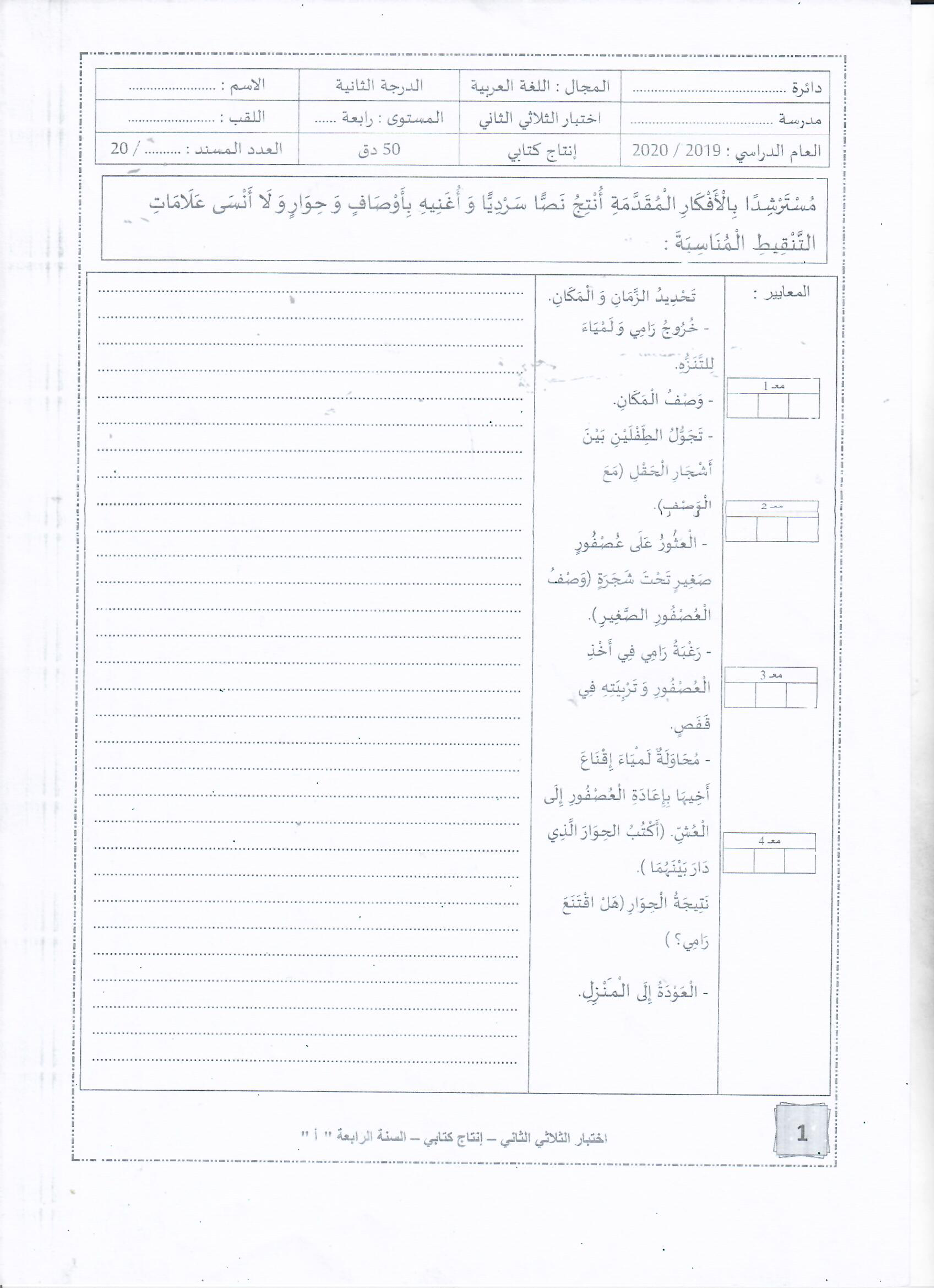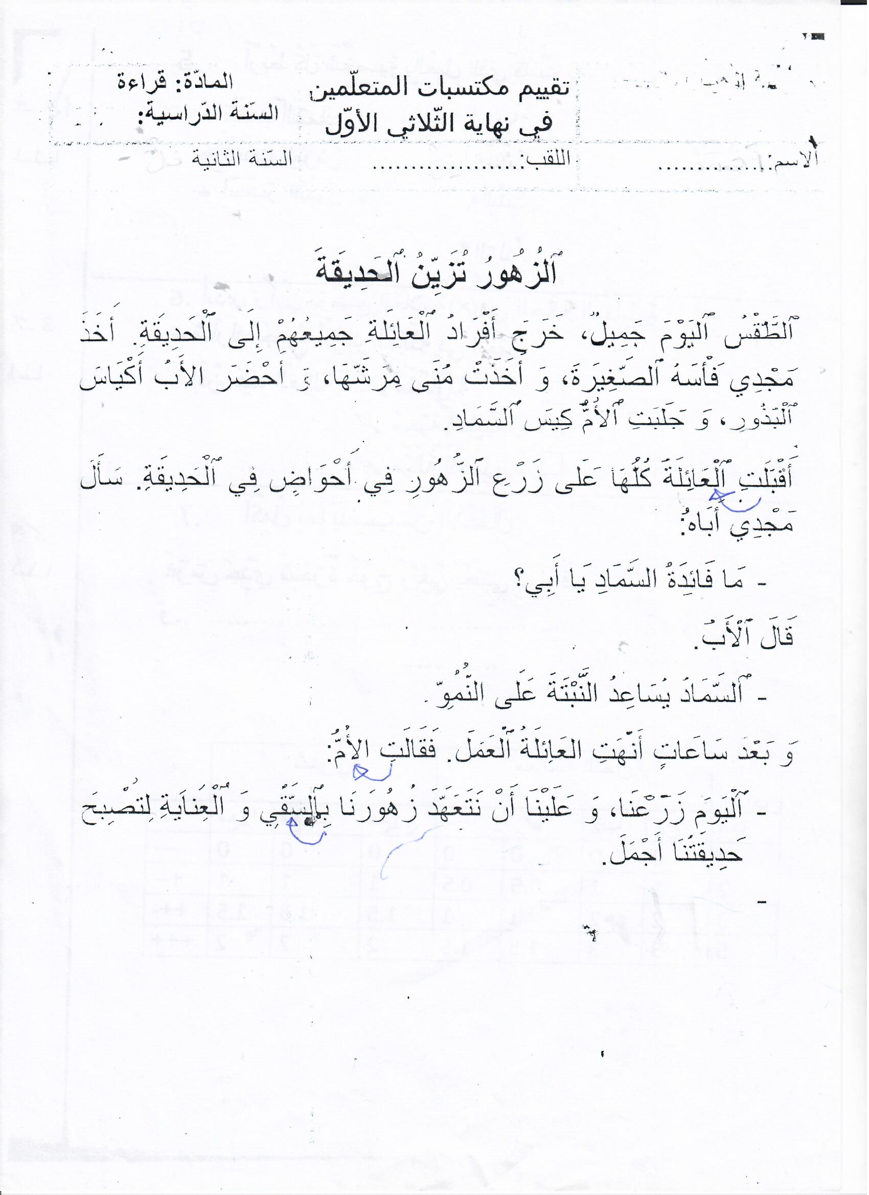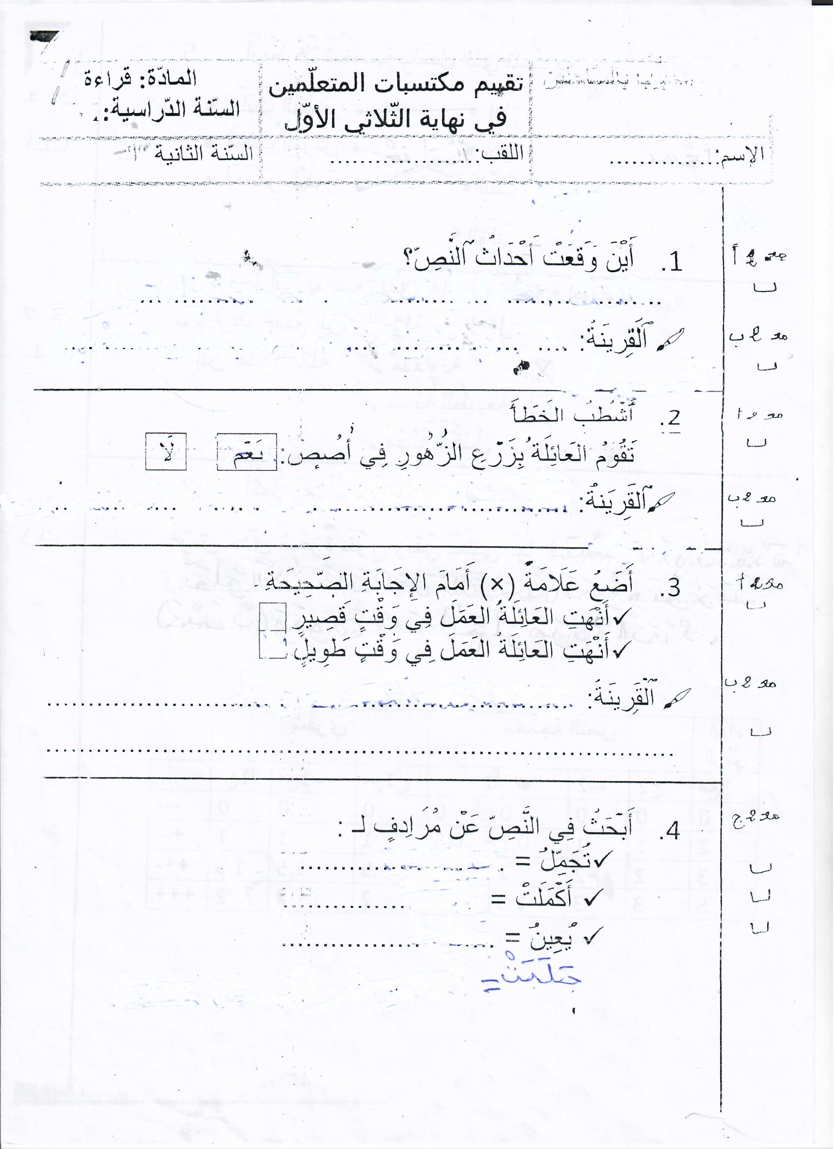 تقييم مكتسبات في نهاية الثلاثي الأول سنة ثانية
