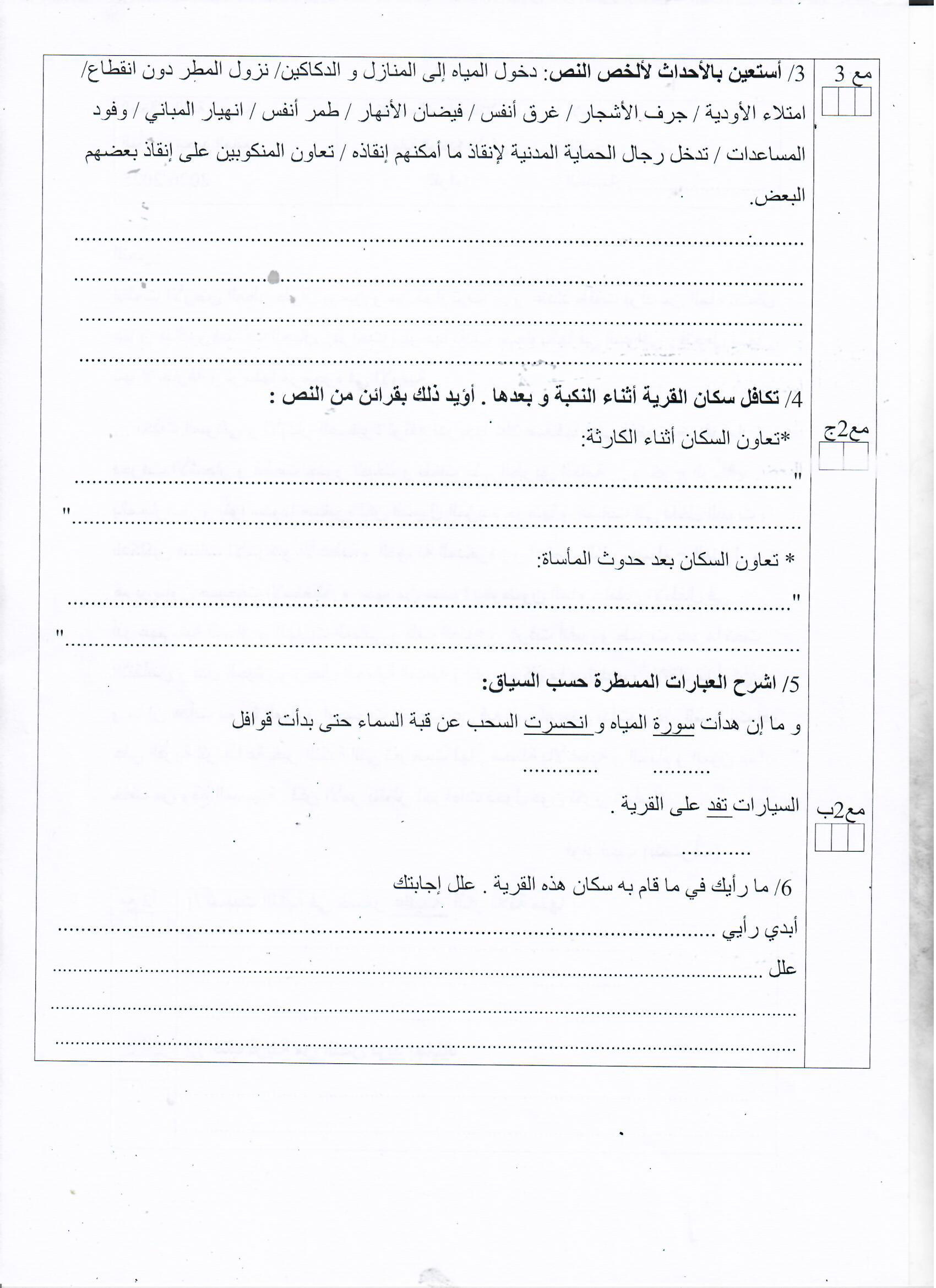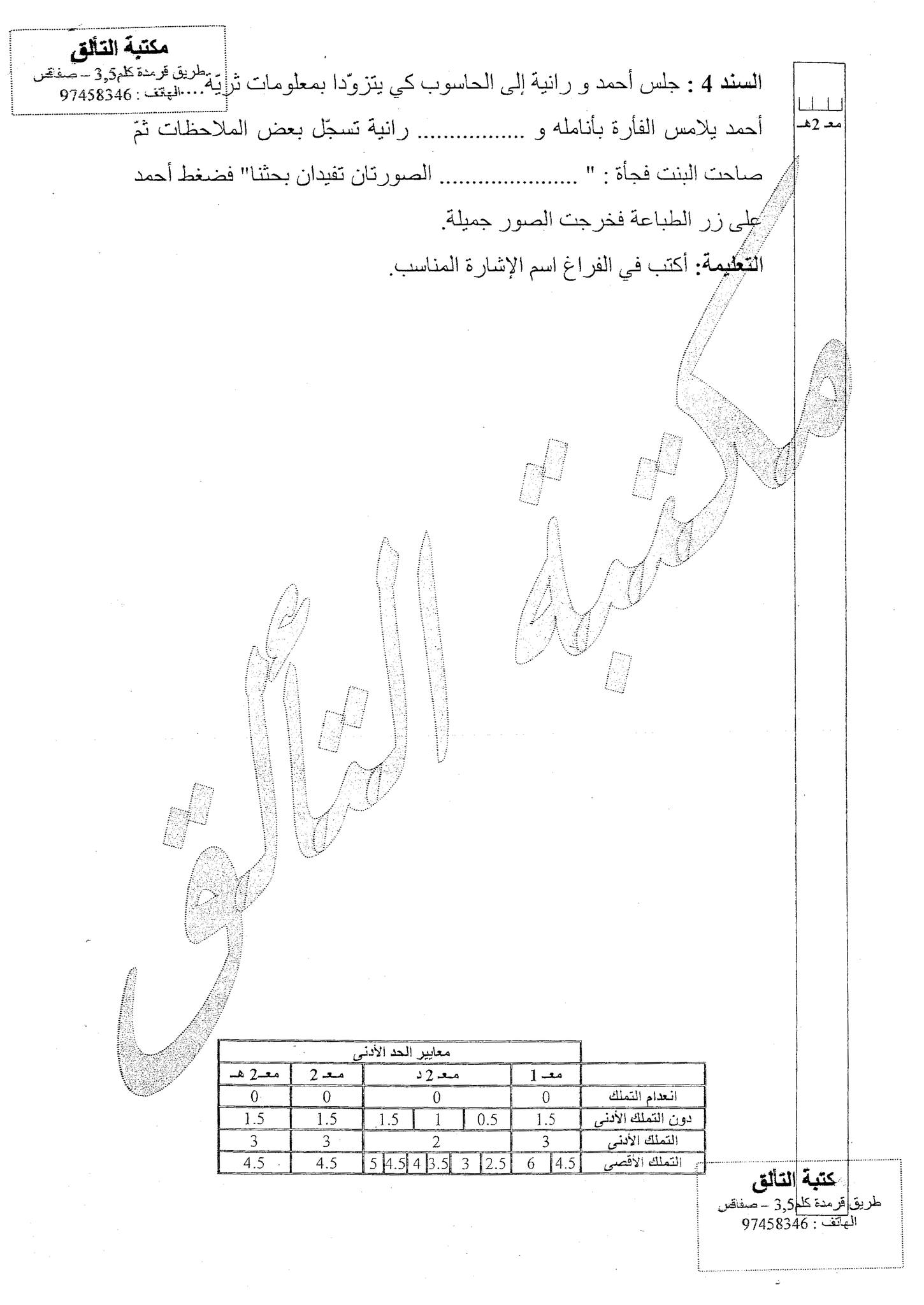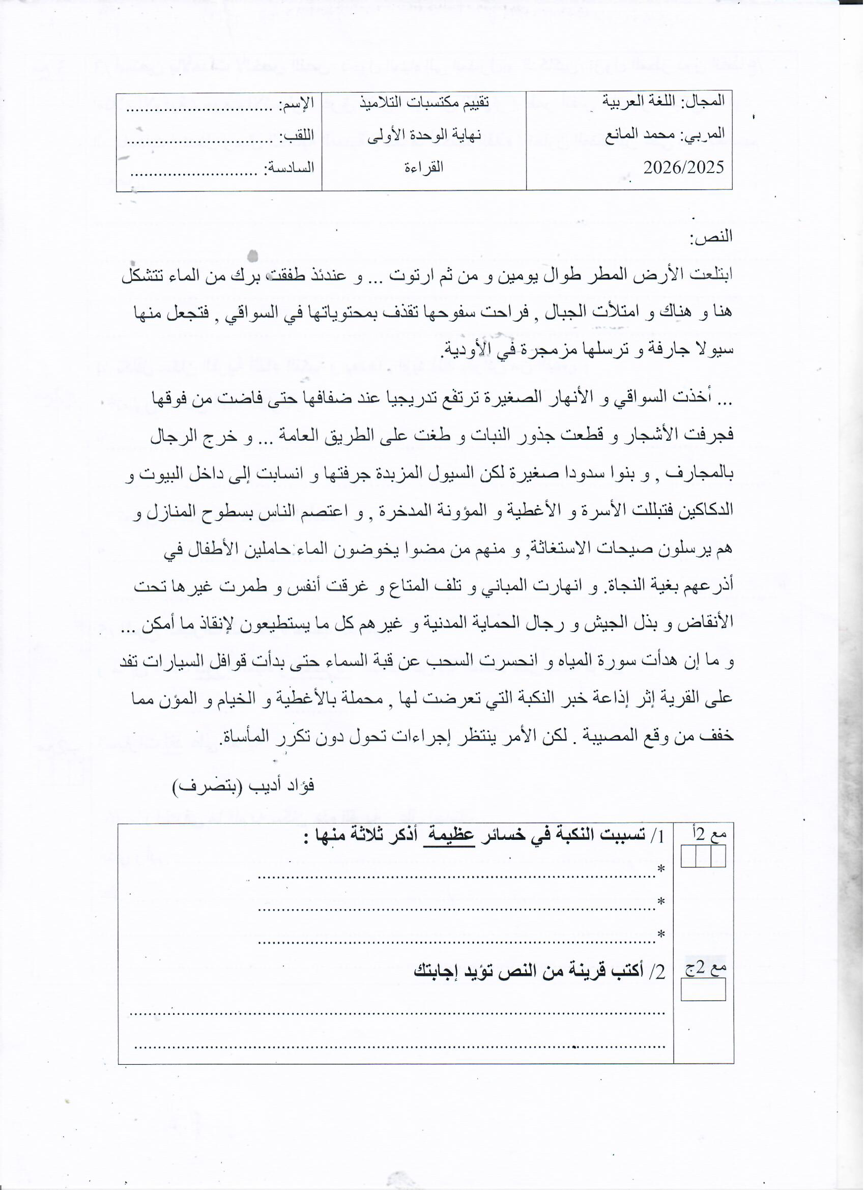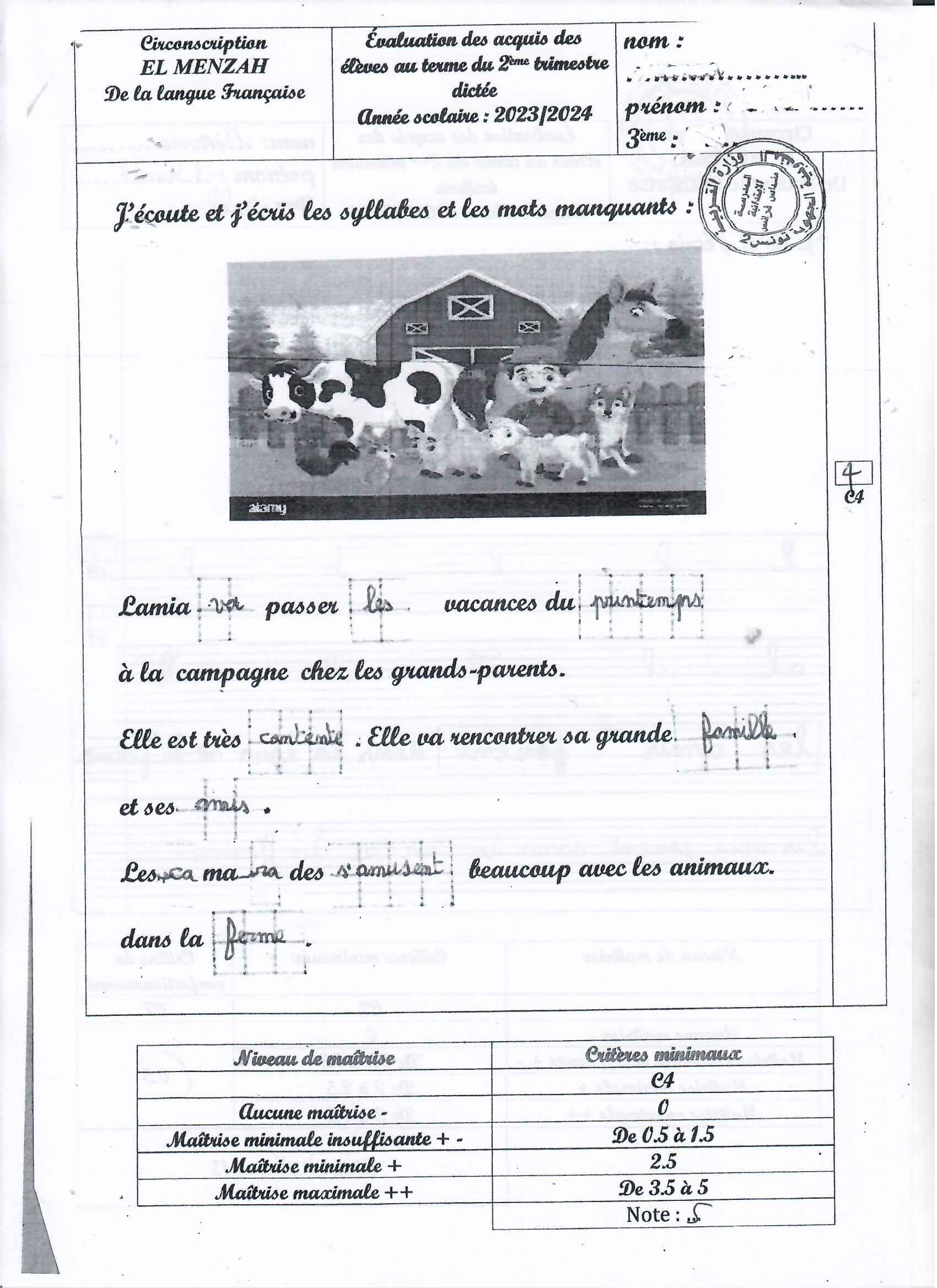 تقييم مكتسبات في نهاية الثلاثي الأول سنة ثانية