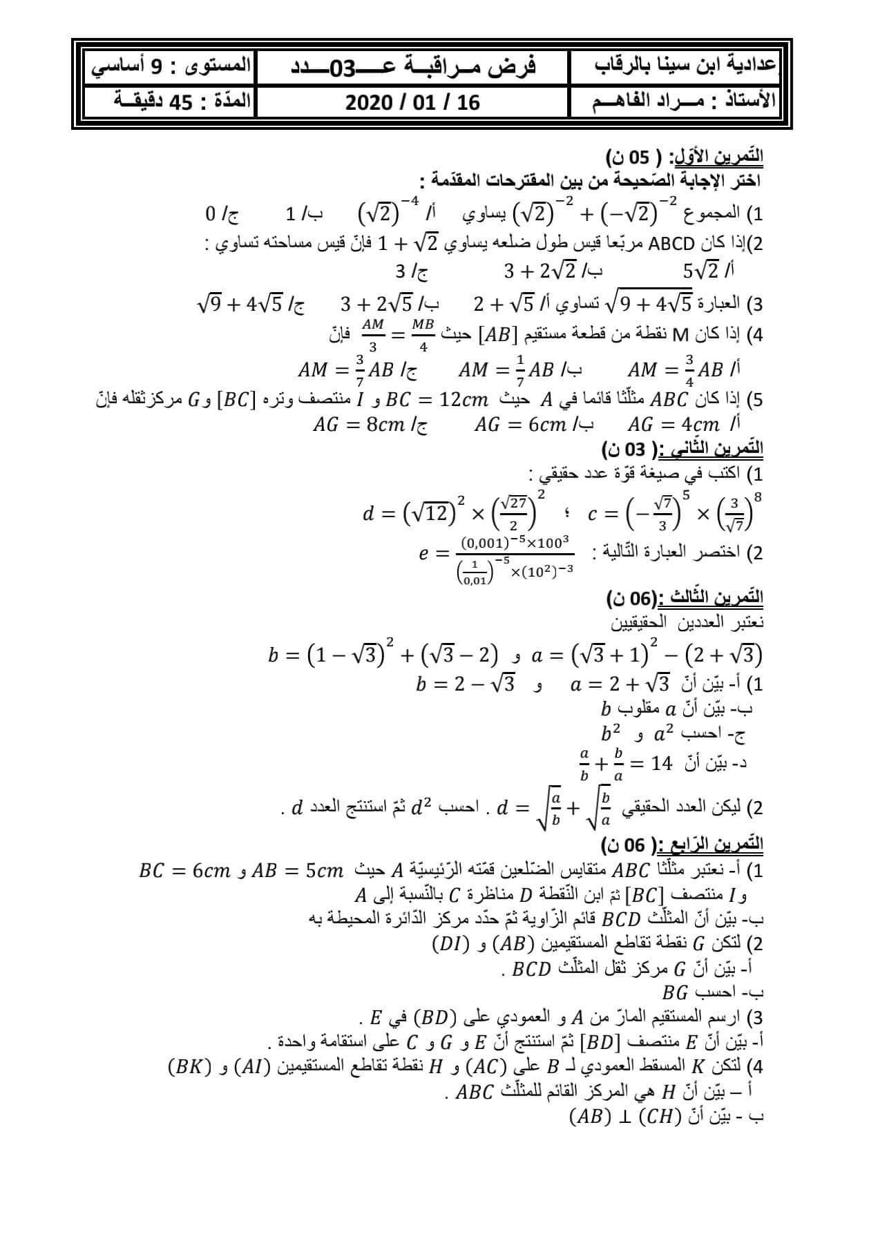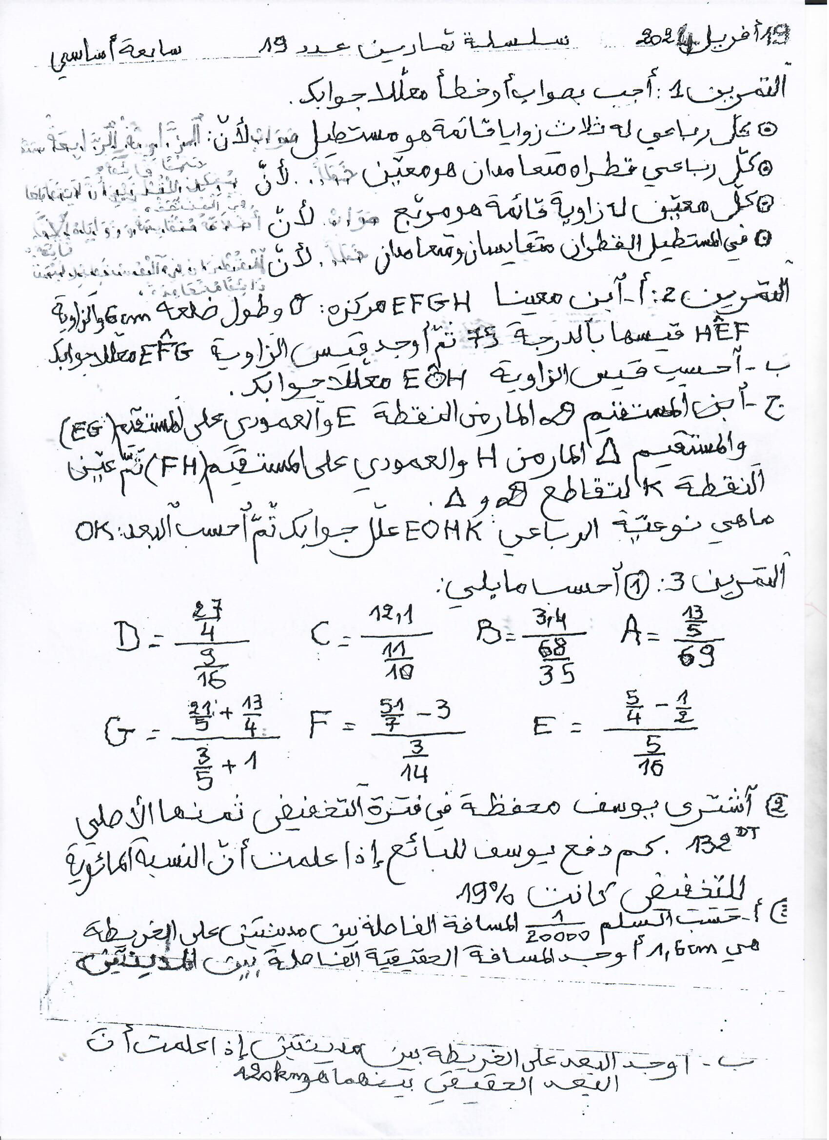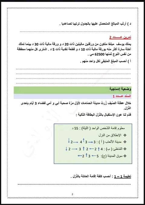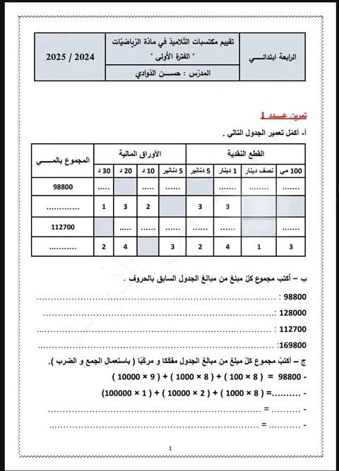 تقييم رياضيات سنة رابعة