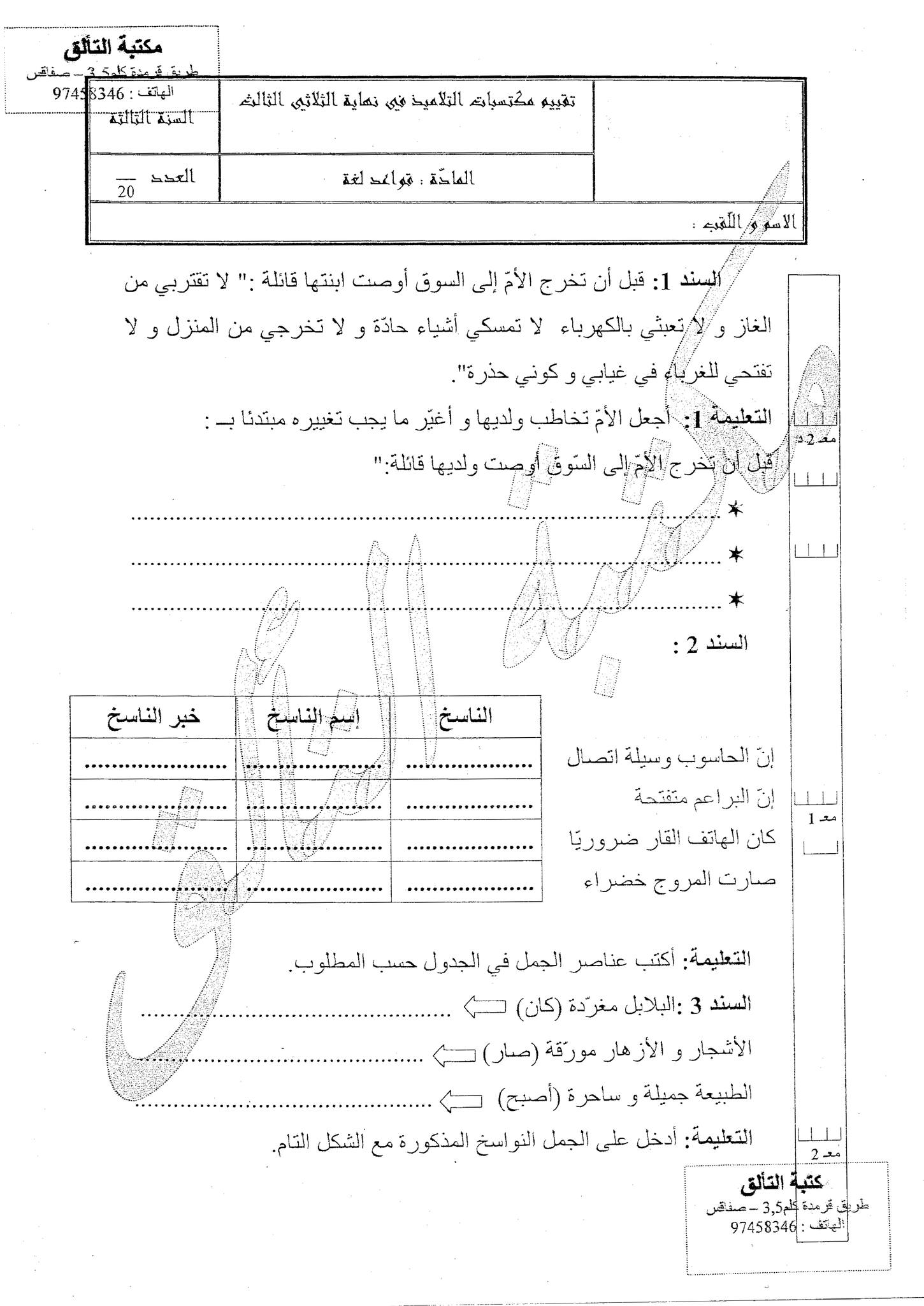 قواعد لغة سنة ثالثة تقييم ثلاثي ثالث